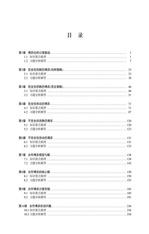 本书是经典博弈论的一本习题集,包括博弈论的公理基础,非合作博弈四大模型与解概念,完全信息静态博弈、动态博弈,不完全信息静态博弈、动态博弈,合作博弈三大模型与解概念,核心、沙普利值,谈判集、核原等经典内容的习题313道。本书特色:一是精确,全书采用了大量的数学符号辅助行文表述,每一道习题的条件交代清晰;二是丰富,习题中既包含基本的概念题和计算题,也包含一定数量比较困难的证明题;三是详细,对书中的每一道习题都给出了详细的解答。