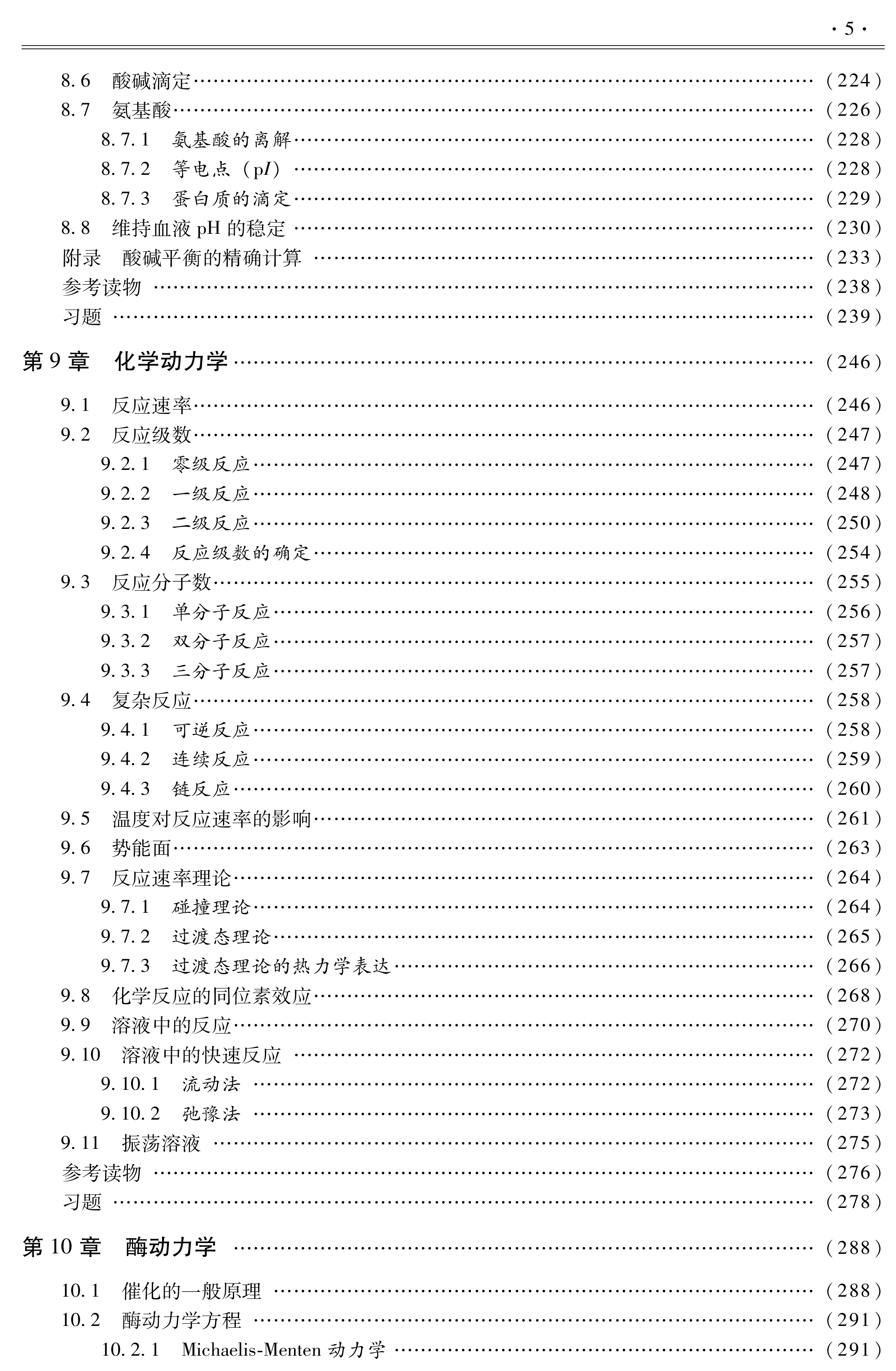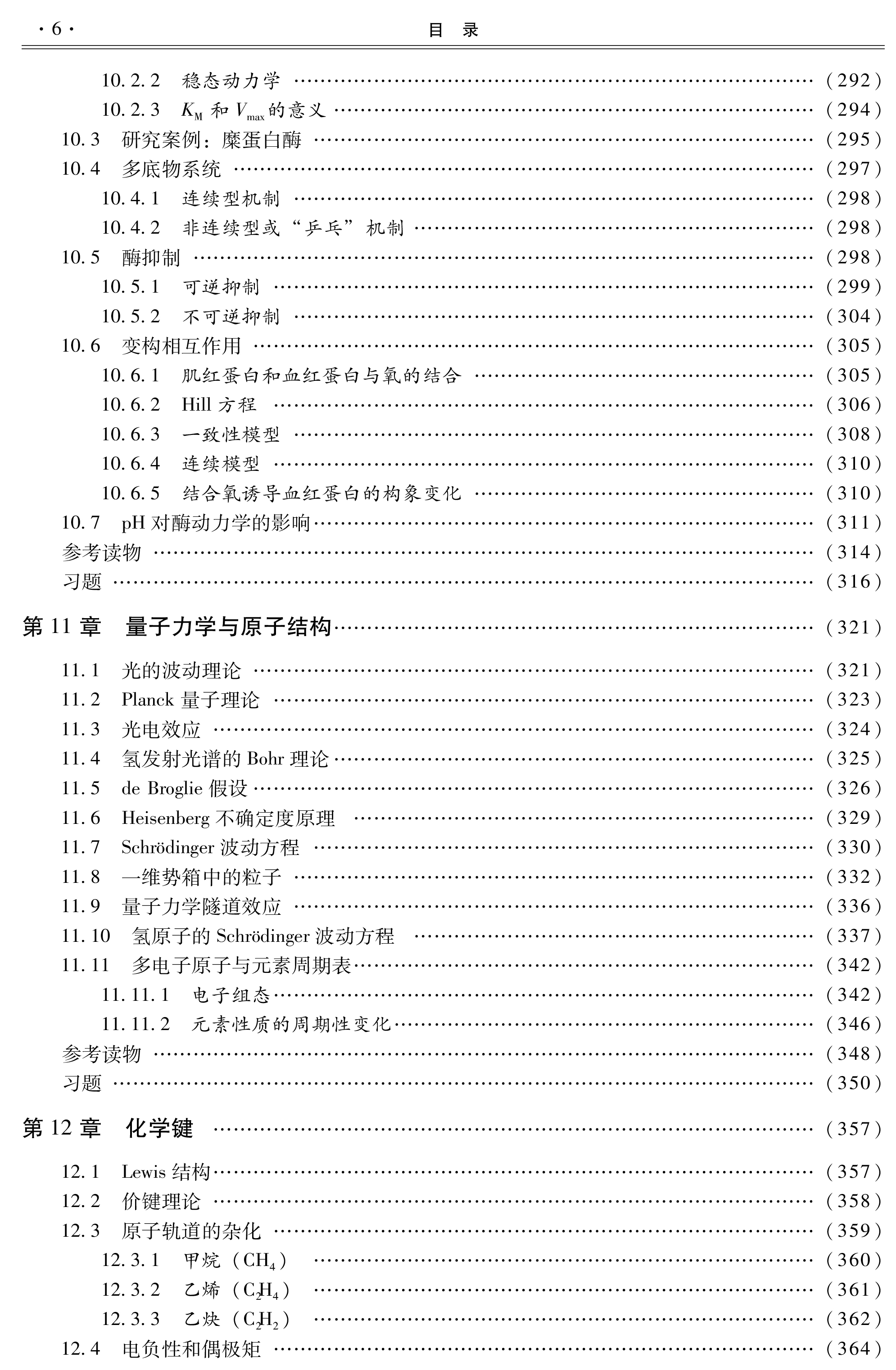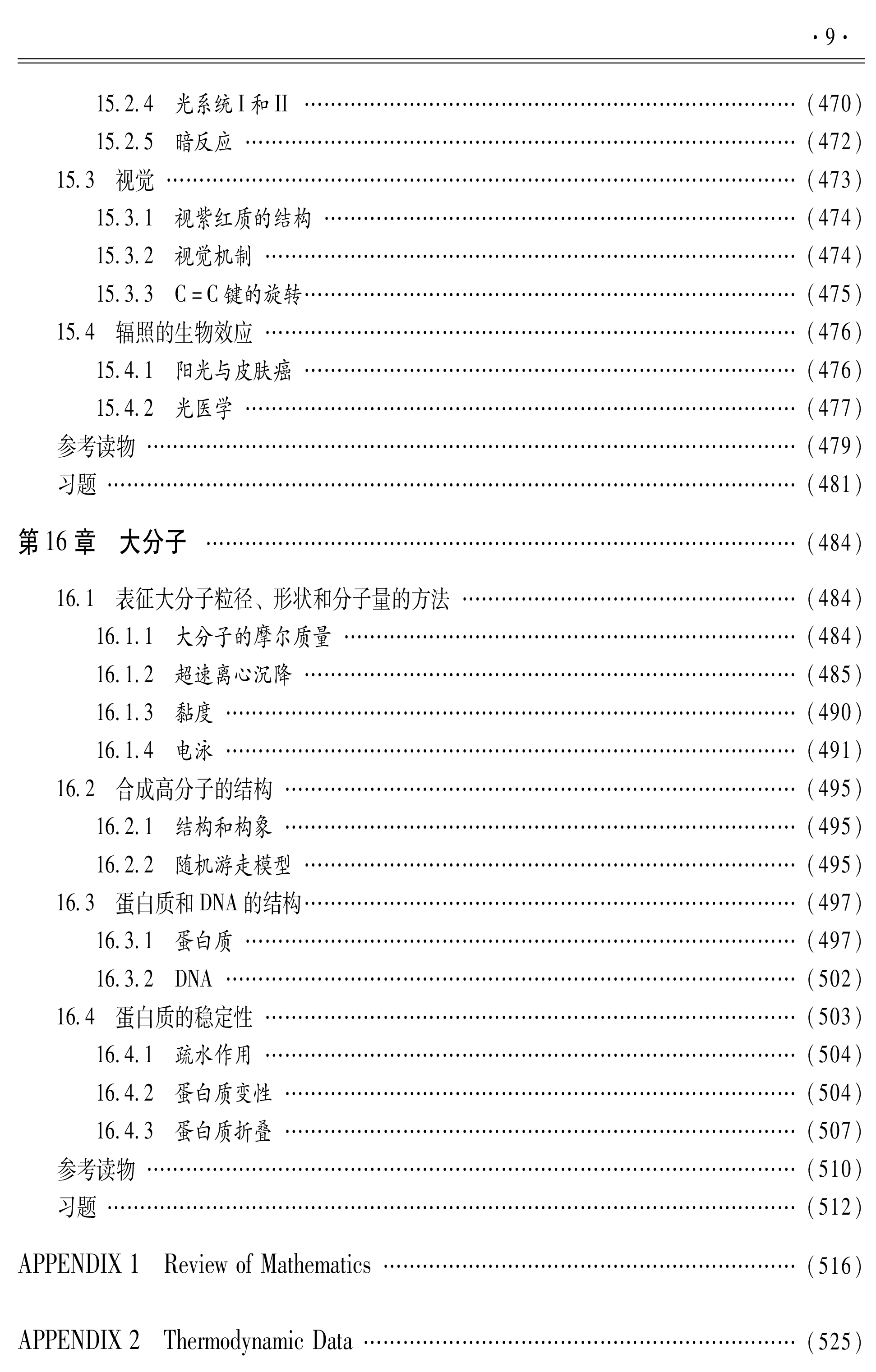 分(热力学第一定律、热力学第二定律、化学平衡)、动力学部分(化学动力学、酶动力学)、物质结构(量子力学和原子结构、化学键、分子间力)以及与生命过程密切相关的知识及应用部分(气体性质、酸和碱、溶液、电化学、光谱、光化学和光生物、大分子)。每章后附原书中的英文习题。