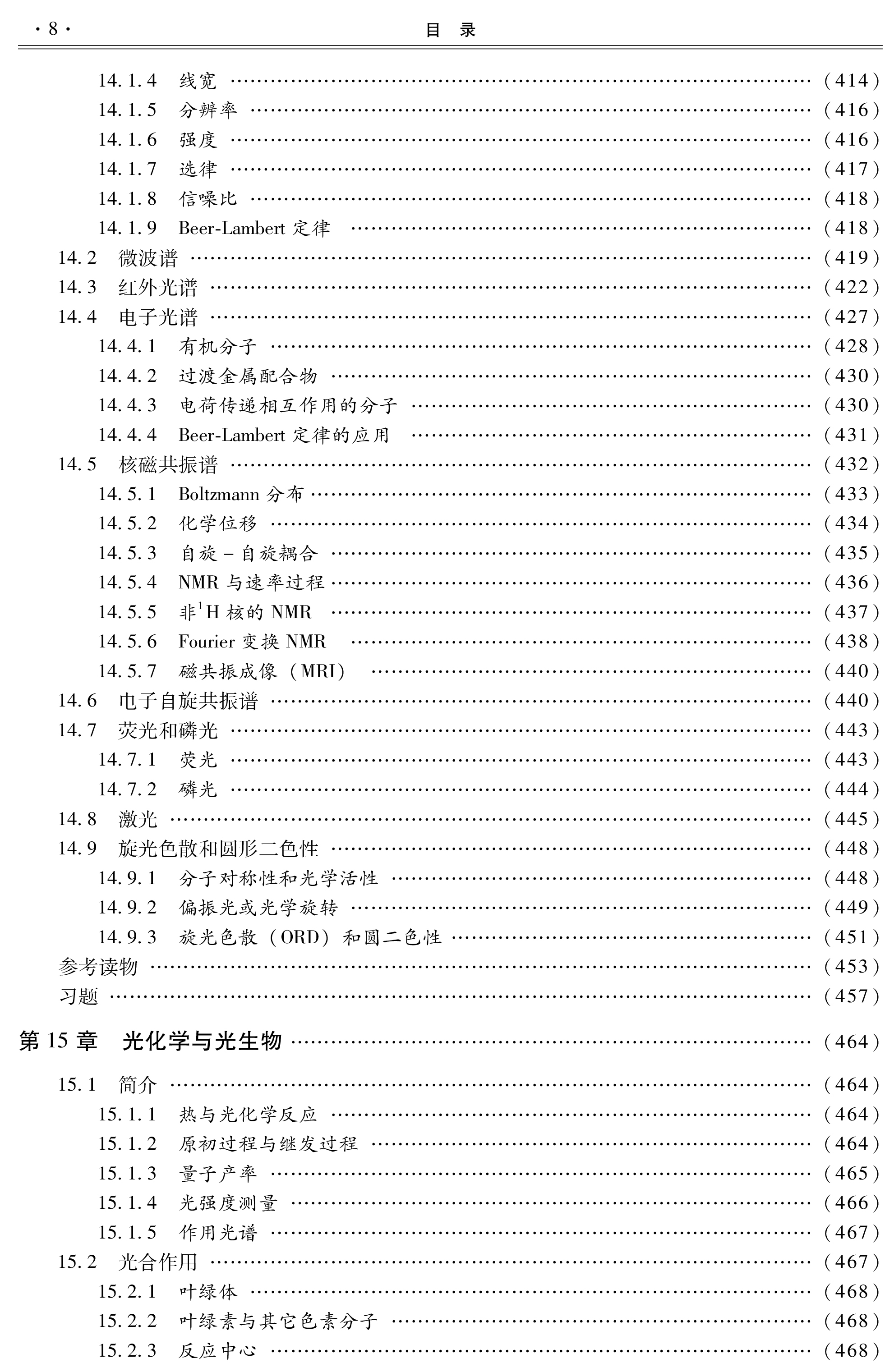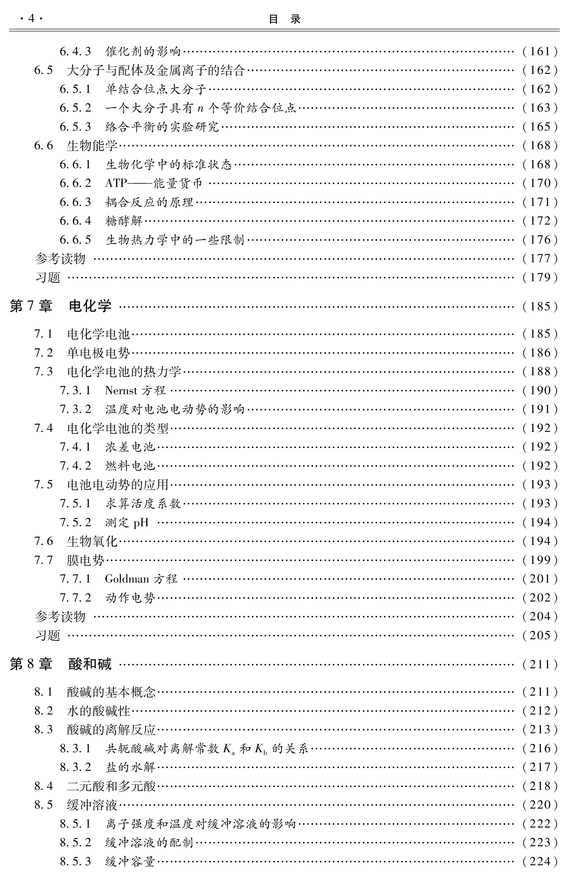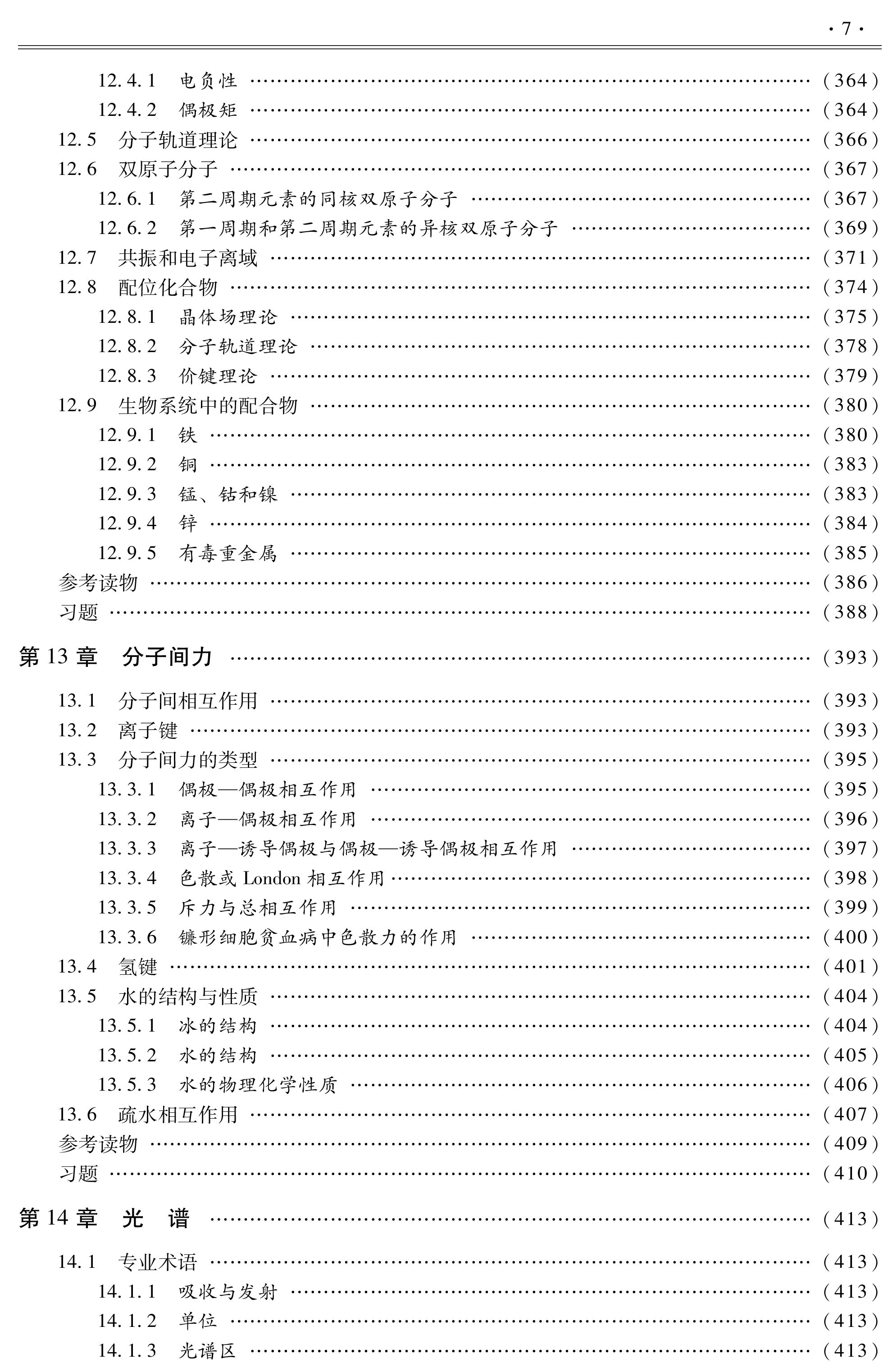 分(热力学第一定律、热力学第二定律、化学平衡)、动力学部分(化学动力学、酶动力学)、物质结构(量子力学和原子结构、化学键、分子间力)以及与生命过程密切相关的知识及应用部分(气体性质、酸和碱、溶液、电化学、光谱、光化学和光生物、大分子)。每章后附原书中的英文习题。