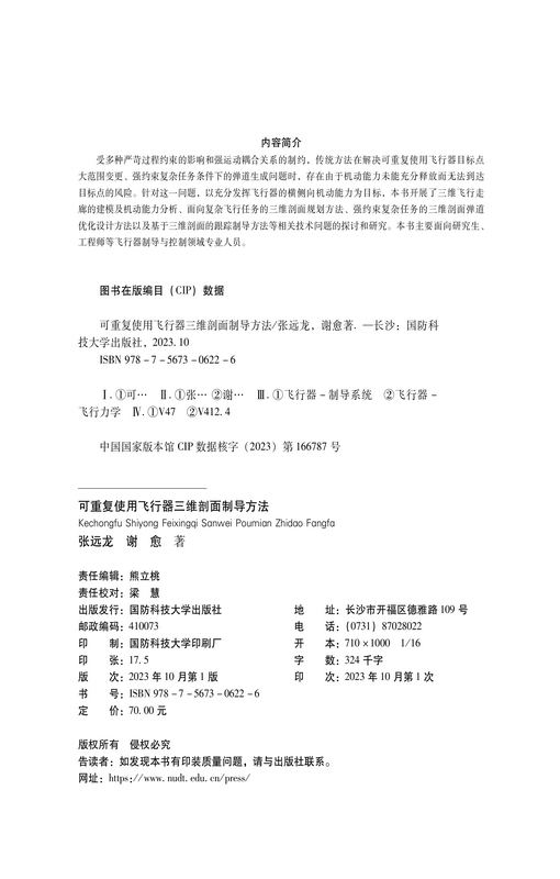 书名:可重复使用飞行器三维剖面制导方法