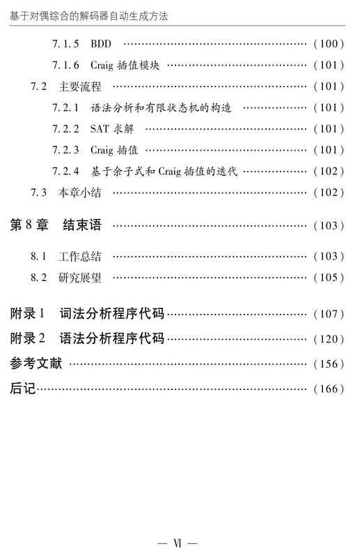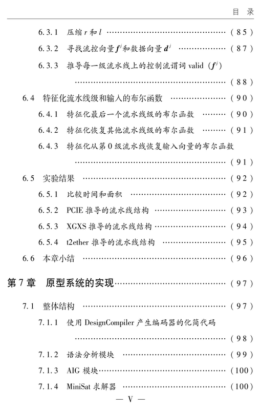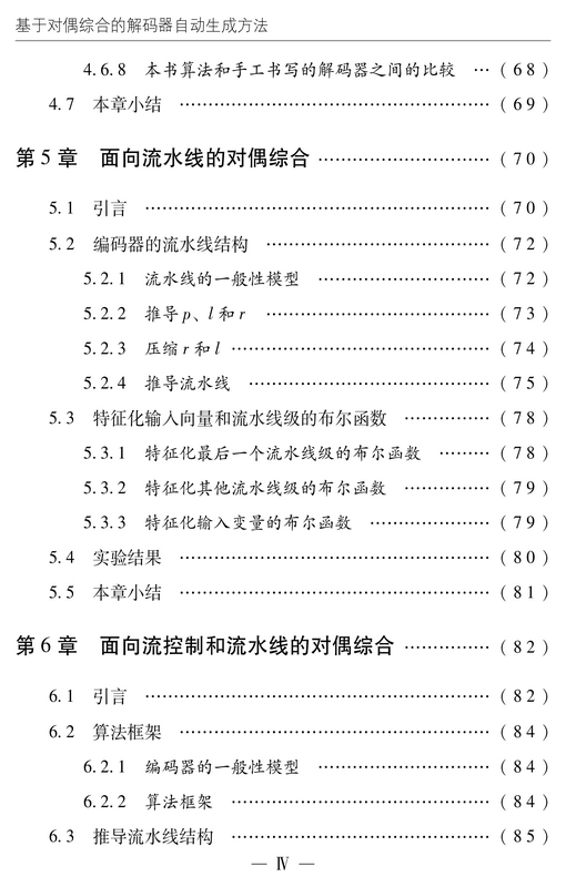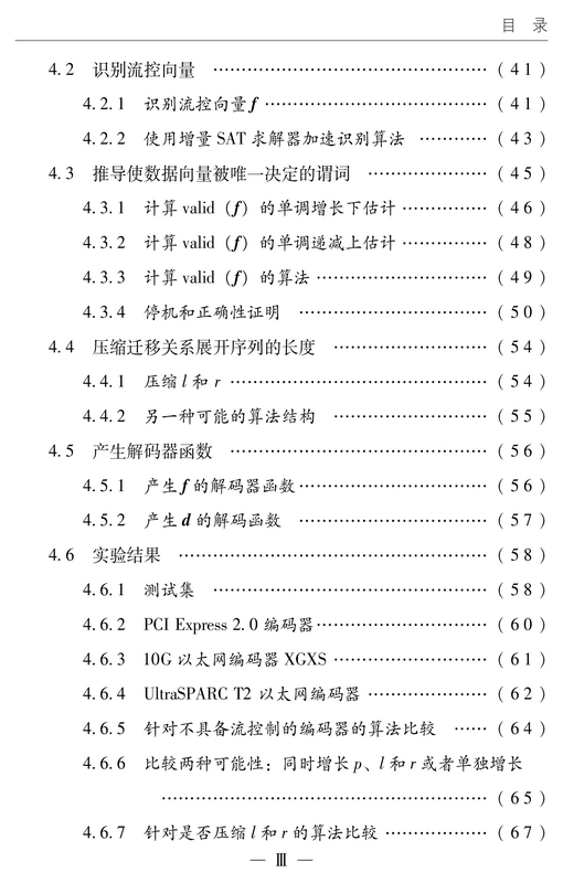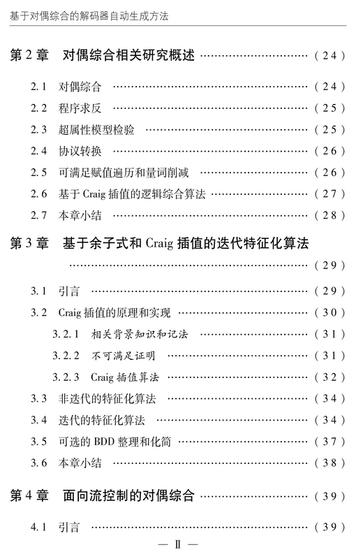 《基于对偶综合的解码器自动生成方法》对基于白盒模型的对偶综合算法中若干关键问题进行了深入的研究,提出了针对流控和流水线结构的解码器自动生成方法和实现方案。理论分析和实验结果验证了所提出算法的有效性和性能,对于进一步促进对偶综合算法的发展和应用具有理论意义和应用价值。本书主要分为八章:绪论、对偶综合相关研究概述、基于余子式和 Craig 插值的迭代特征化算法、面向流控制的对偶综合、面向流水线的对偶综合、面向流控制和流水线的对偶综合、原型系统的实现、结束语。