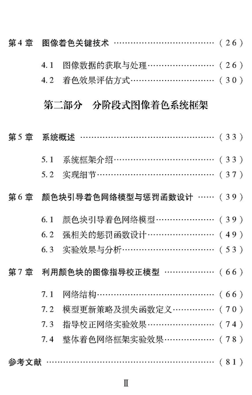 根据图像着色的基本映射关系和深度学习技术,本书提出一种基于深度学习的两阶段式端到端图像着色网络模型框架,对于给定的一维灰度图像输入映射出三维彩色图像输出。该网络模型框架分为两个阶段,即:第一阶段,使用初步着色网络对灰度图像赋予基本的颜色;第二阶段,使用颜色块对初步着色网络生成的图像进行校正,使得最终输出的结果更加接近真实图像。本书分为两个部分,共7章。第一部分,介绍图像着色基础知识,其中:第1章,概述图像着色的研究背景;第2章,总结图像着色问题的几类解决办法;第3章,梳理当前主流的深度学习网络模型;第4章,讲述使用深度学习进行图像着色时需要考虑的关键技术。第二部分,介绍本书的分阶段式图像着色系统框架,其中:第5章,概述了整个系统架构;第6章,讲述颜色块引导着色的模型及强相关惩罚函数设计;第7章,介绍使用颜色块指导校正的模型。