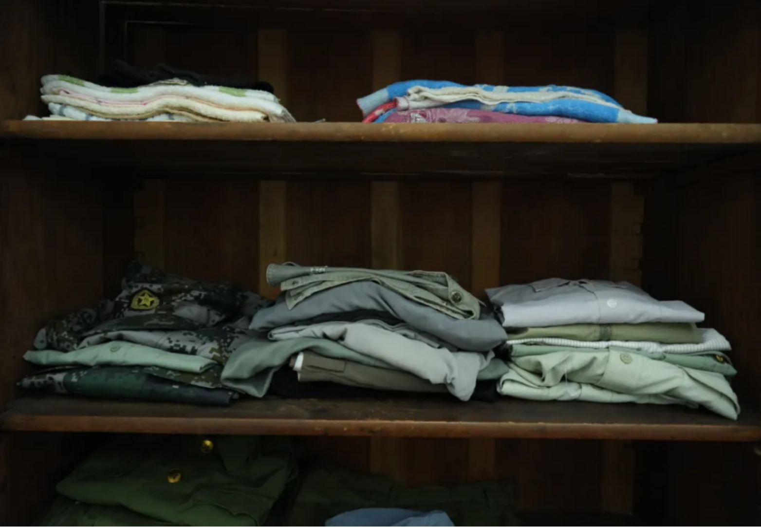 衣柜里的衣服大多是老式的旧军装,为数不多的几件便装除了儿子买给他的,一般都要穿几十年。比如,这件破洞背心,从壮年到高龄,陪伴他度过了最艰辛的奋斗岁月;穿着破洞背心干着上亿元事业的老人,是网友们心中的最强“扫地僧”。
