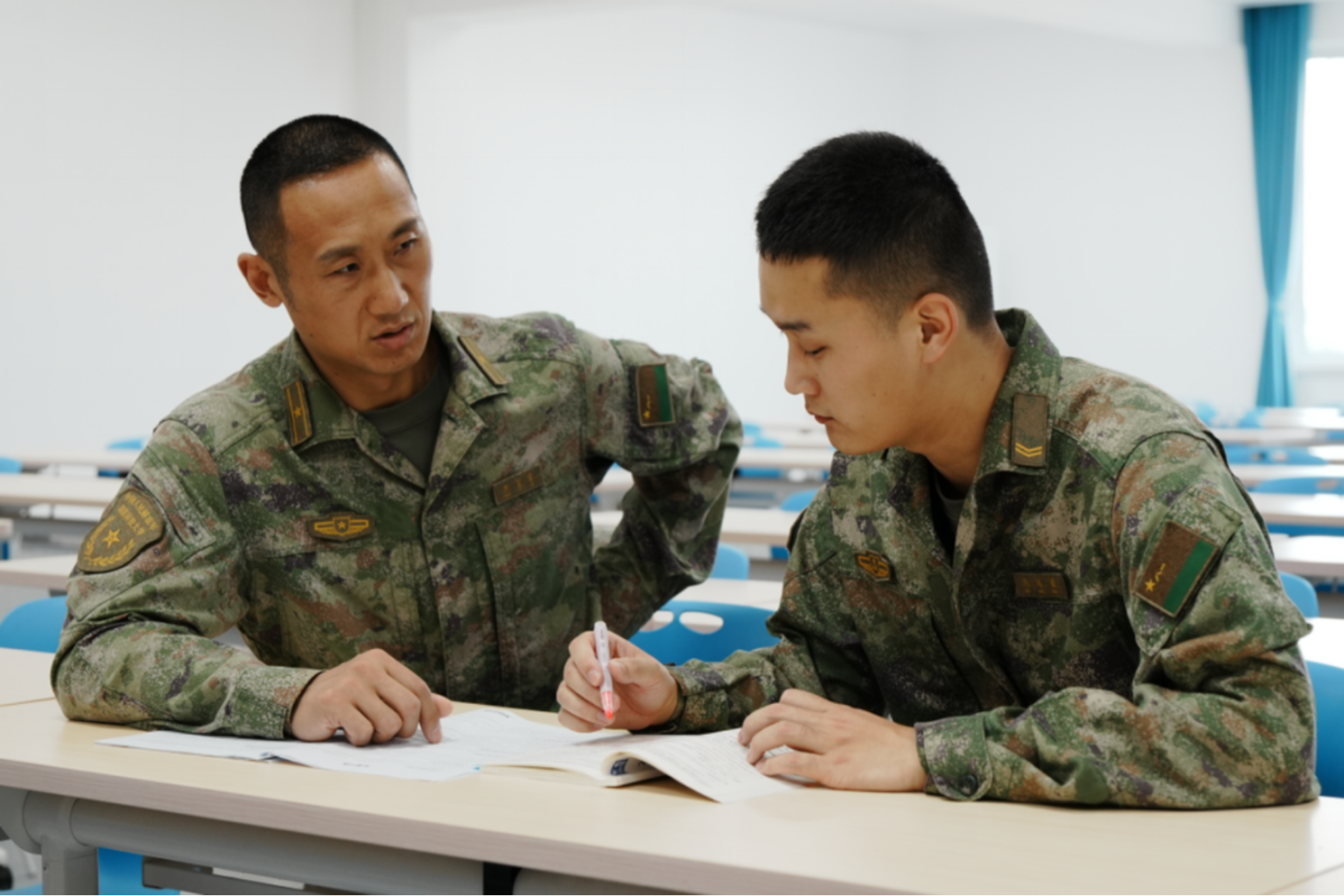 教导员洪宜雷推门而入,手里捧着精心收集的历年真题:“今晚咱们专攻数学,近几年士兵考军校的题型都在这儿!”自那以后,晚上只要有时间洪宜雷就会出现在马英豪自习的教室,有时是几句简单问候,问问近期复习进度,有时是默默陪伴,让自习教室的身影不再孤单。