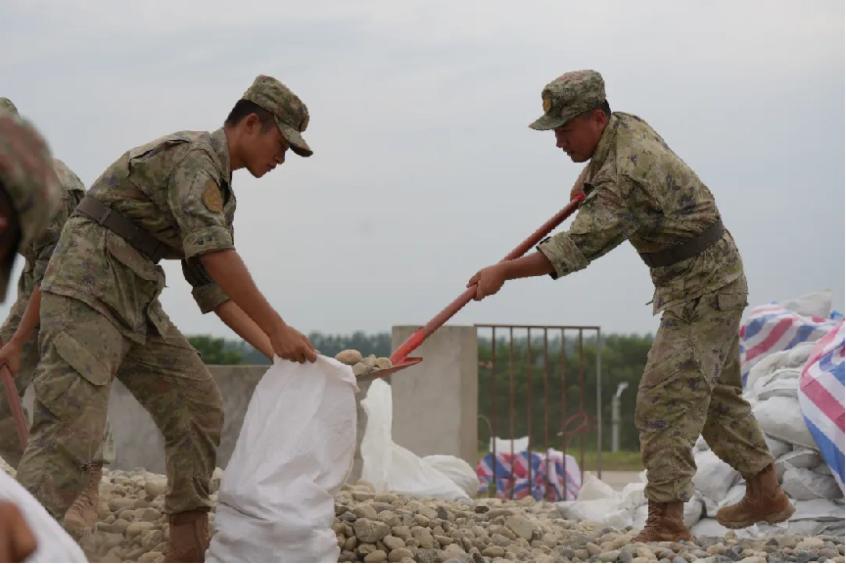 ▲吴阳(右一)带领连队官兵进行抢险排险作业