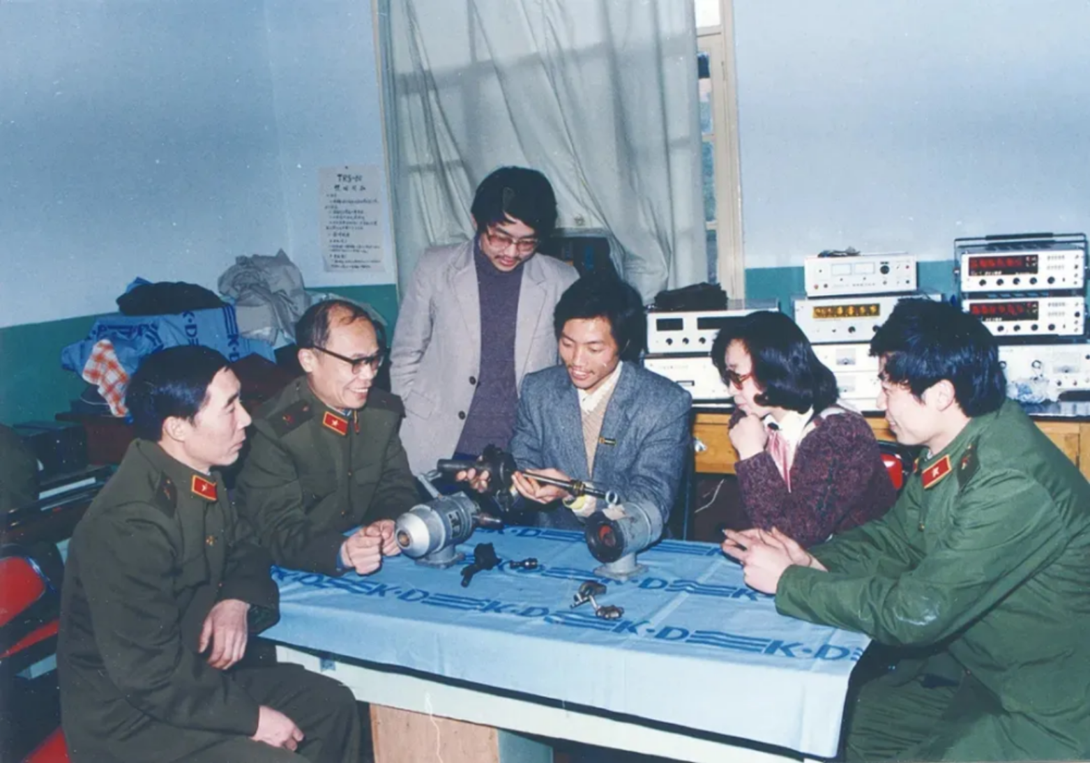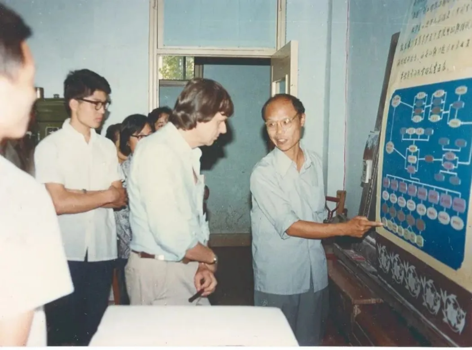 1983年,庄逢辰(右一)向燃烧专家F.A.Williams介绍液体火箭发动机燃烧过程综合模型的研究思路