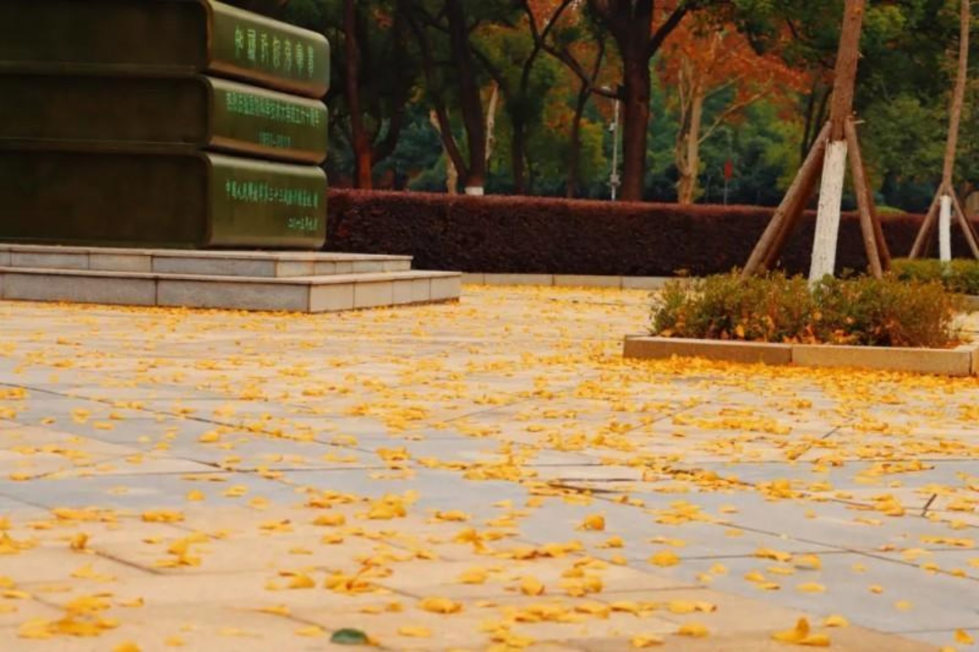 金叶为毯,秋色为幕,校园一隅悄然铺展一卷沉静而深情的时光之书。银杏落叶如鎏金铺地,叠成岁月的书页,温柔覆盖着来往的足迹;左侧那座书形雕塑静立于光影之间,墨绿色“书脊”上的字样庄重而清晰,与疏影斑驳交错,仿佛历史与自然在此低语。