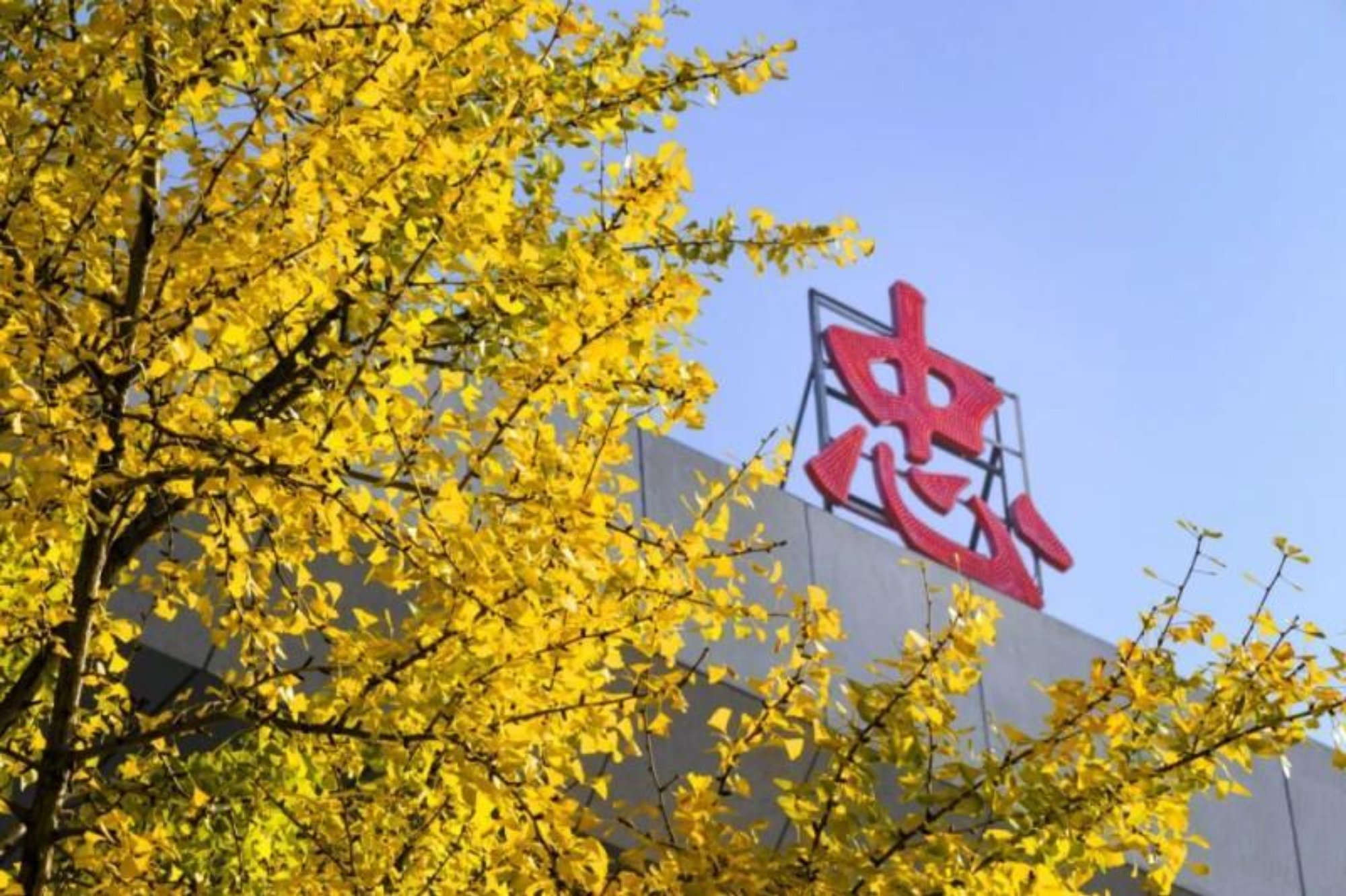 一号院图书馆大楼顶部,“忠”字巍然矗立、光芒四射。一侧银杏树枝叶繁茂,金黄的叶片层层叠叠,在阳光照耀下熠熠生辉。红与黄在澄澈无垠的蓝天映衬下,色彩对比鲜明,格外夺目动人。不仅展现了校园秋日之美,更将精神象征与自然之美融为一体。