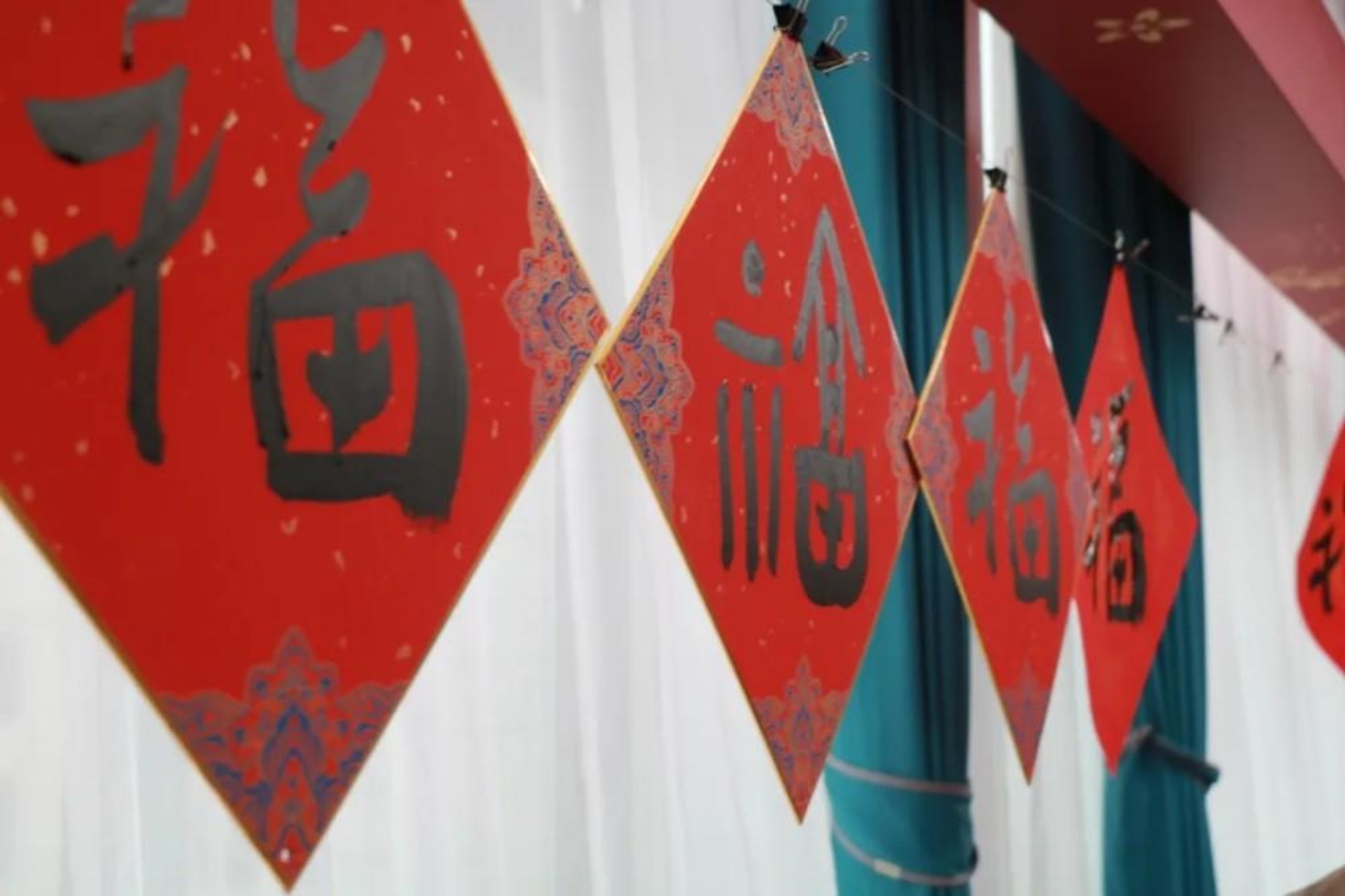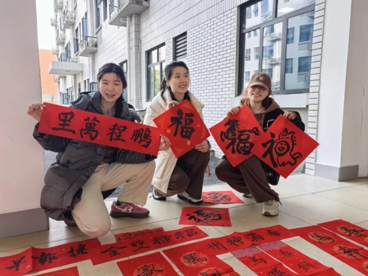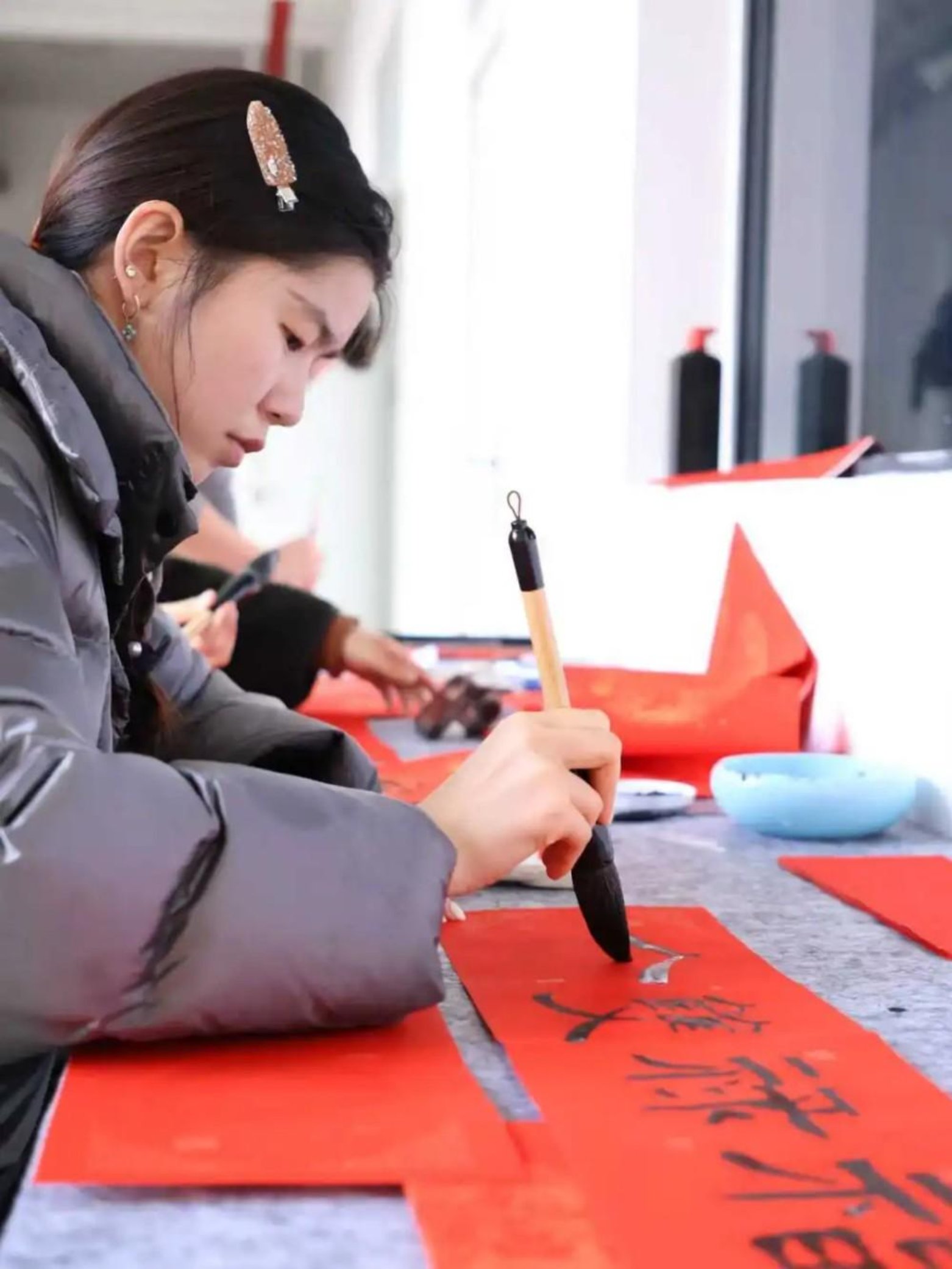 大家摩拳擦掌、跃跃欲试,铺展红纸、提笔蘸墨,瞬间沉浸在创作的热忱中,富有创意的“福”字笔尖绽放。同学们边写边交流心得,欢声笑语中互赠祝福,墨香与暖意交织,既舒缓了科研学业的压力,更凝聚起师生员工携手奔赴新征程的青春力量。
