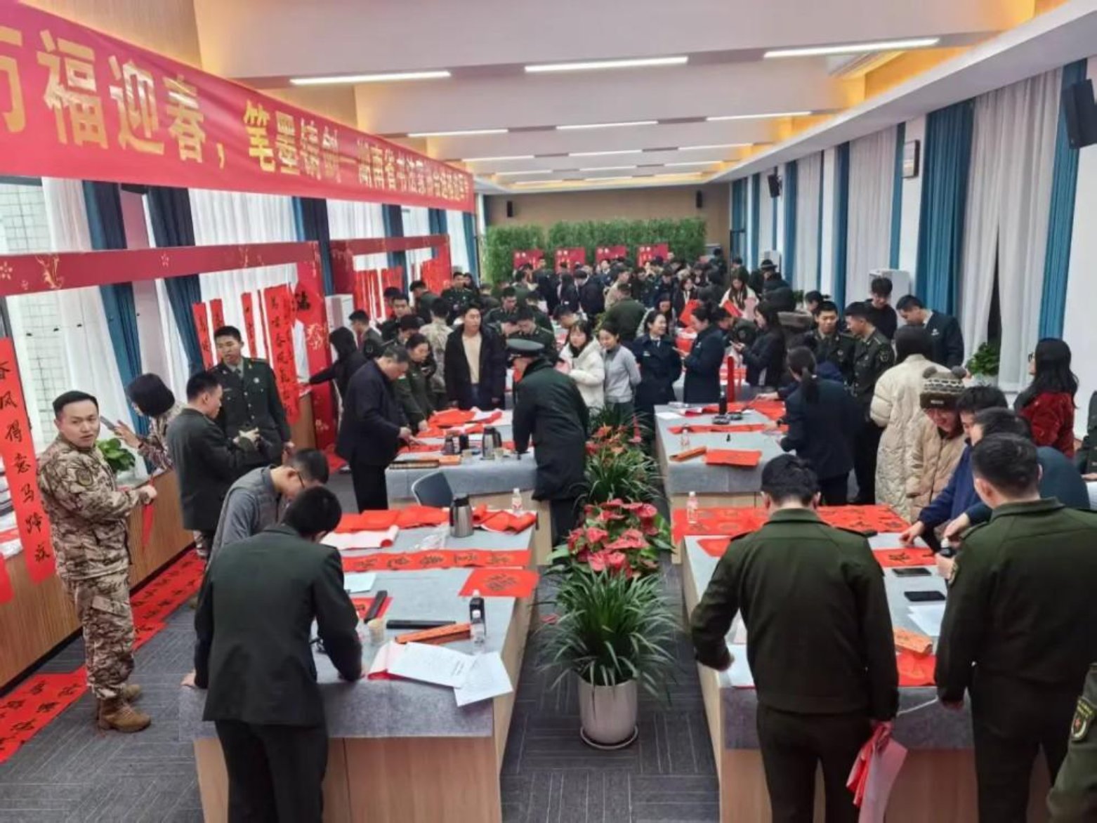 1月30日上午,“万福迎春·笔墨铸剑”活动在军政基础教育学院温情上线。湖南省书法家协会、学院政治工作处与笔剑雄风书法俱乐部联手,将文化关怀送到师生员工身边。鄢福初、李砺、崔向君等名家化身“文化使者”,挥毫泼墨间将祝福融入笔墨。这些红彤彤的春联与“福”字,既满足了贴春联迎新春的民俗需求,更让强军信念在笔墨间生根发芽。