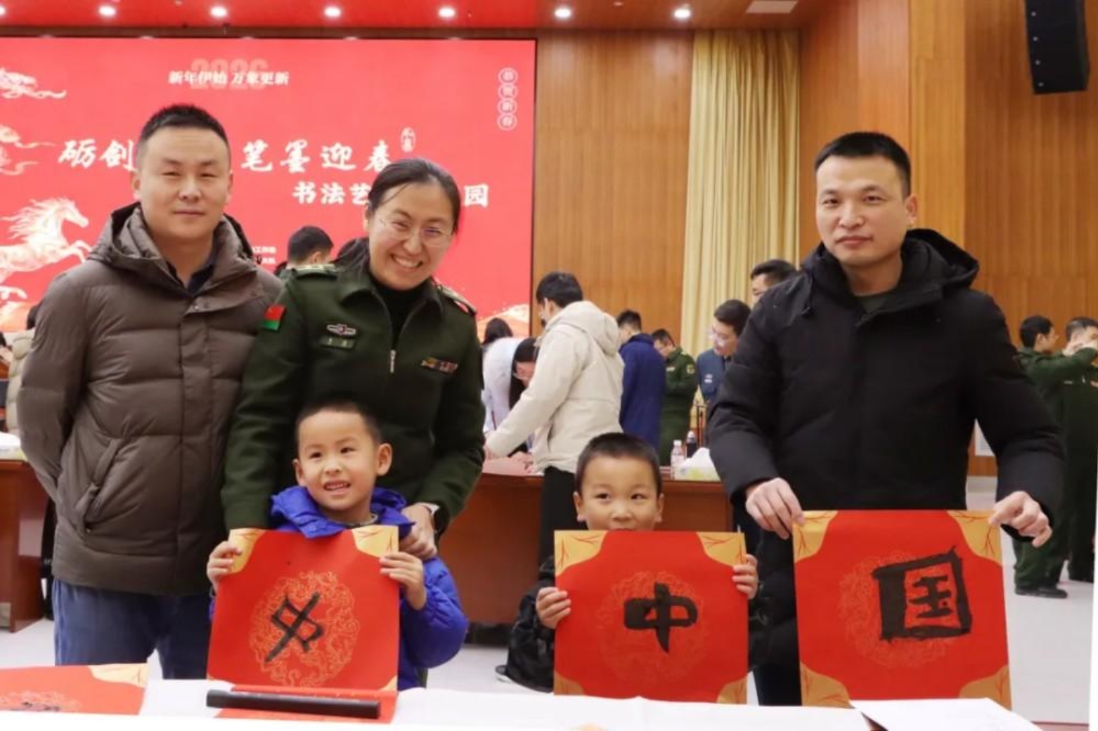 体验区里,学员们学得格外认真,握笔、运腕、落笔有模有样,卷起刚写好的春联时,嘴角笑意藏不住:“看着这红彤彤的春联,年味一下就来了!”活动结束后,书法家与师生员工代表手持作品合影,定格冬日温暖瞬间。自创春联寄托强军报国之志,在一笔一画间感受传统文化魅力,展现出“昂扬向上、奋勇争先”的精神风貌。