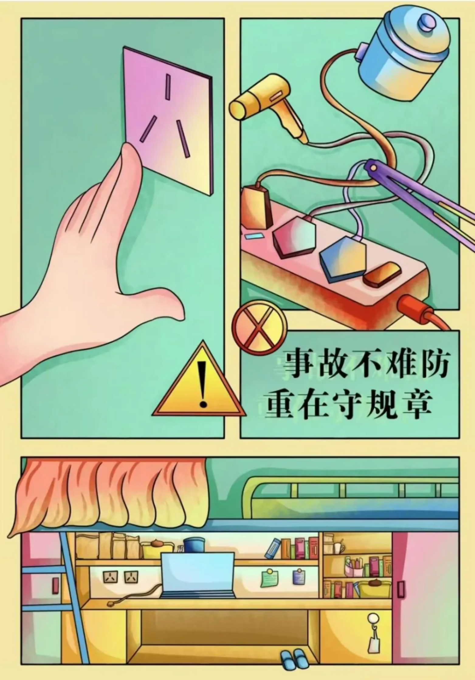 宿舍内严禁使用大功率违规电器,如电炉、热得快、电暖器等,这些电器容易引发火灾。同时,不要私拉乱接电线,离开宿舍时要关闭所有电器电源,拔掉插头,养成良好的用电习惯。