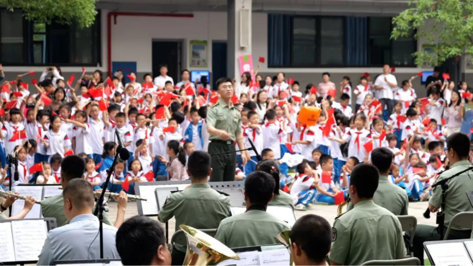 毛泽东同志诞辰130周年纪念日,韶山铜像广场上,军乐团整齐列队,奏响庄严肃穆的《东方红》;六一儿童节,国防科大八一小学的校园里,《孤勇者》《粉红豹》等小而精的旋律和孩子们的欢声笑语交织在一起;国庆节日的三号院主干道上,军乐团联合仪仗俱乐部行进间表演,路人跟随军乐团的音乐,齐声高唱《歌唱祖国》……