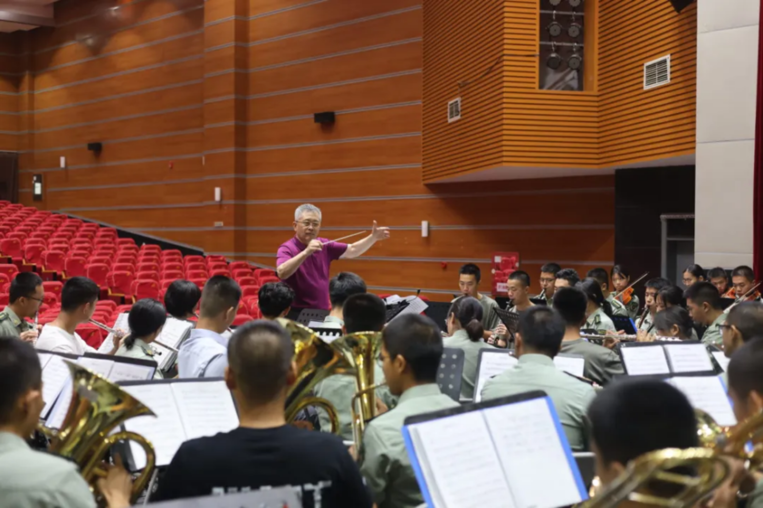 推开排练室的门,原解放军军乐团团长于海一行悉心指导排练。在大师的执棒下,乐团演奏水平得到质的提升。