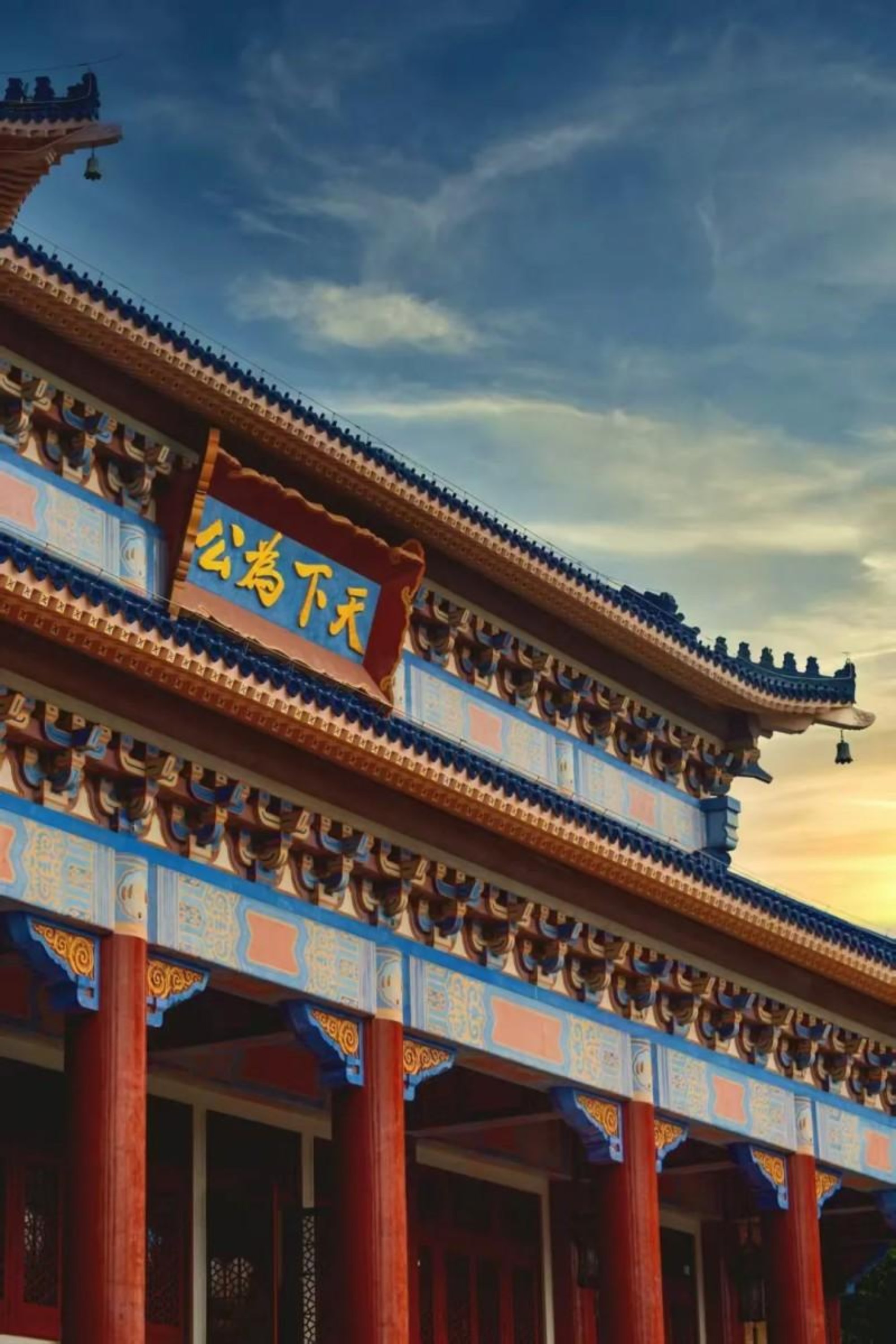 蓝天白云之下,中山纪念堂巍然矗立。朱红立柱挺拔巍峨,蓝黄彩绘斗拱精巧繁复,飞檐翘角尽显中式古建神韵。檐下“天下为公”鎏金匾额苍劲醒目,在蓝天白云与霞光映照下,建筑庄严肃穆,承载着伟人精神与厚重的历史文化底蕴。