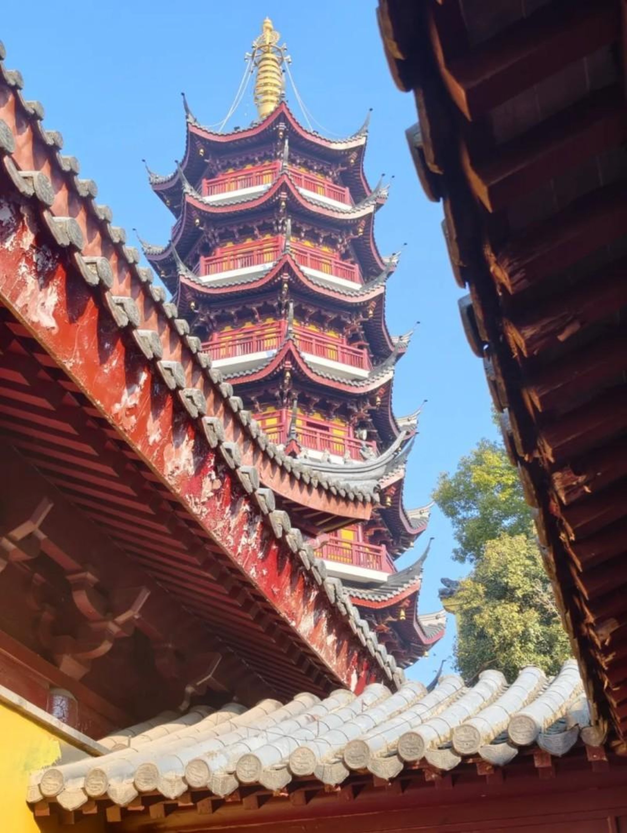 晴空如洗,鸡鸣寺檐角如框,朱红飞檐层叠而上,青灰瓦当缀着岁月苔痕。药师佛塔如笔直插蓝天,暖艳朱漆衬着澄澈晴空,凝定塔身载千年禅意,层层檐角是时光年轮,诉说着古刹晨钟与江南文脉。