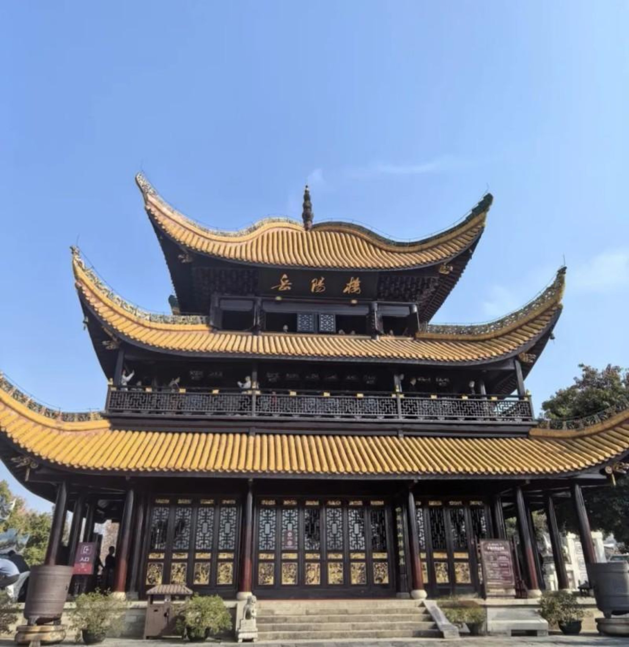 三层主楼覆以金黄琉璃瓦,飞檐如翼,在黑柱朱栏的映衬下格外庄严。正中央“岳阳楼”匾额笔力遒劲,俯瞰着楼前葱茏绿意。整座建筑在湛蓝晴空的背景下轮廓分明,飞檐、琉璃瓦与雕花窗棂尽显古韵,呈现出“气蒸云梦泽”的恢弘气象。
