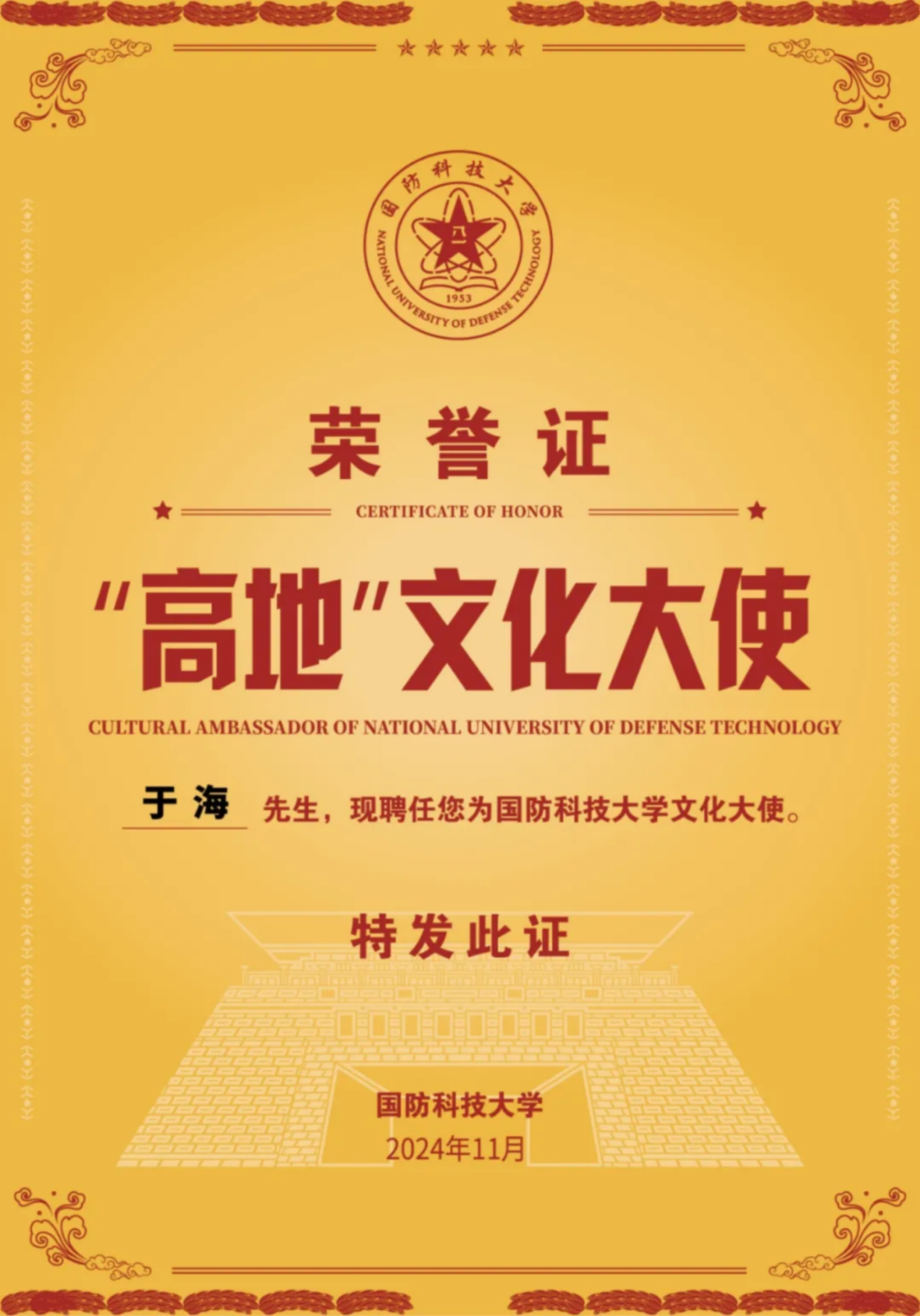 为深入贯彻落实中央军委办公厅印发的《繁荣发展强军文化实施纲要》,聚力打造学校“高地”文化品牌,11月19日下午,beat365平台唯一官网“高地”文化大使颁授仪式在长沙校区三号院音乐厅举行,学校政委陈国强为中国人民解放军军乐团原团长、国家一级指挥于海颁发学校首位“高地”文化大使荣誉证书并讲话。