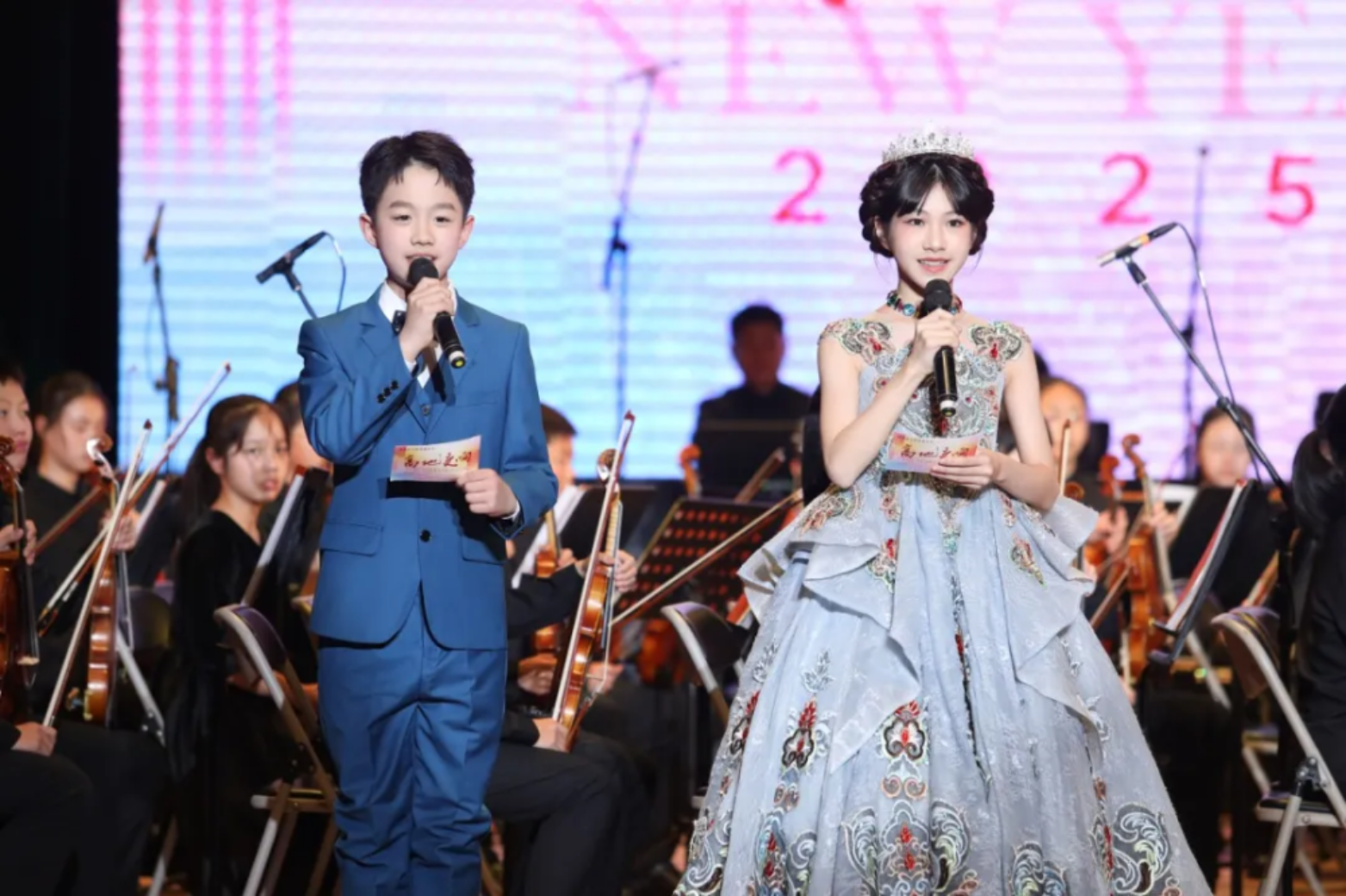 女高音歌唱家高铭与八一小学王晓伟老师携手演绎的《灯火里的中国》,将音乐会的氛围推向了高潮。清亮而富有穿透力的声音,与乐队宏大的配乐相得益彰,描绘了一幅幅灯火辉煌、繁荣昌盛的中国画卷。在悠扬的旋律中,每一位青少年都被深深感染,心中涌动着对祖国的无限热爱和对未来的美好憧憬。