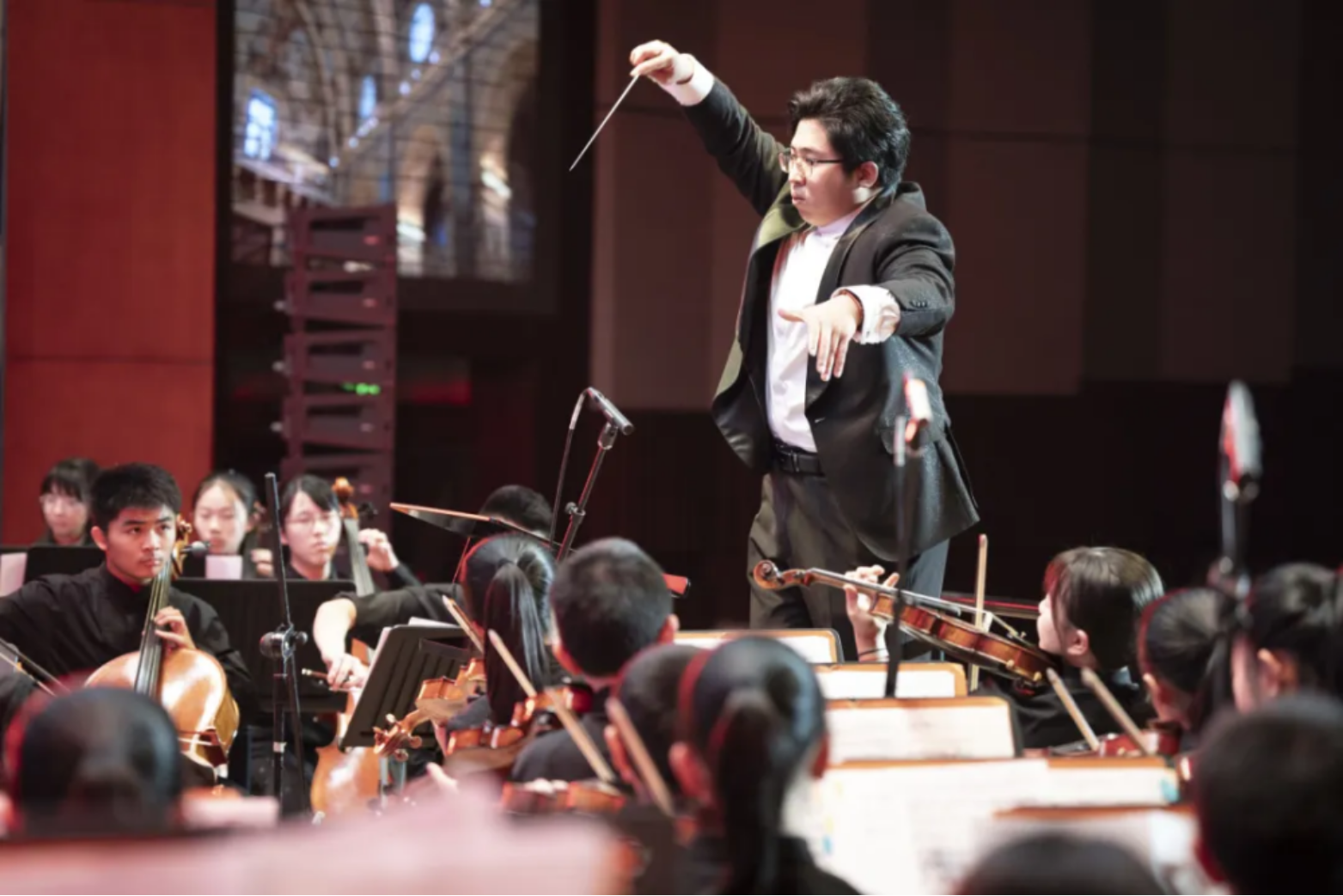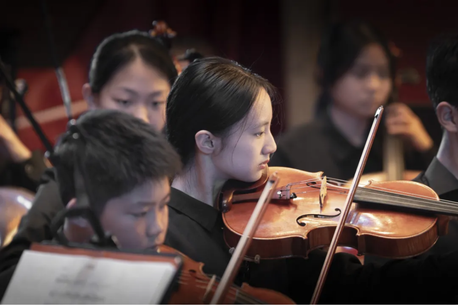 音乐会在湖南青少年交响乐团演奏的管弦乐《晚会》中拉开序幕。欢快的节奏和丰富的音色,瞬间点燃现场气氛。音符跳跃间,仿佛带领师生们穿越到一个充满欢声笑语的聚会中,这不仅是对青春活力的颂歌,也是对新时代青少年幸福生活的真实写照。