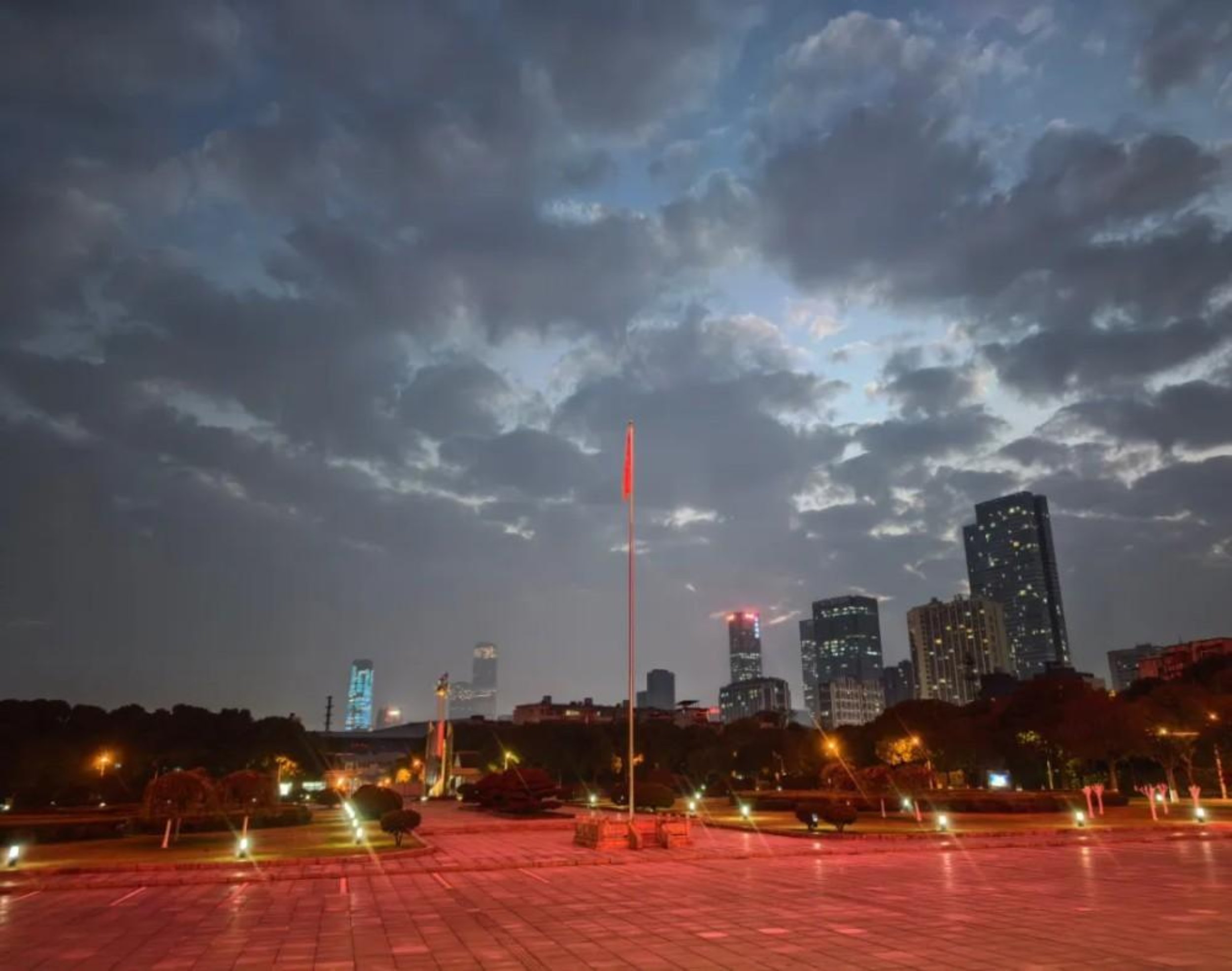 暮云裹着灰蓝天幕,广场国旗静立,城市楼宇灯火渐明,暖光浸红地砖。冷暖色调在此碰撞,柔云衬银楼,夜色初临的朦胧里,温柔与肃穆共生。