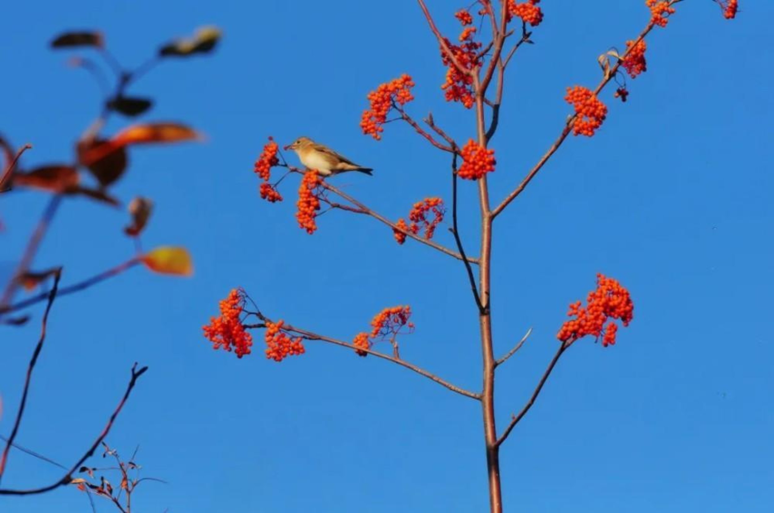 湛蓝晴空下,红果如焰缀满枝桠,一只雀鸟静立其间。浅棕羽色与艳红浆果形成温柔对比,它垂首的姿态似在聆听秋风私语。简洁构图中,生命与自然的呼应悄然流淌,将秋日的静谧与鲜活凝于一瞬。