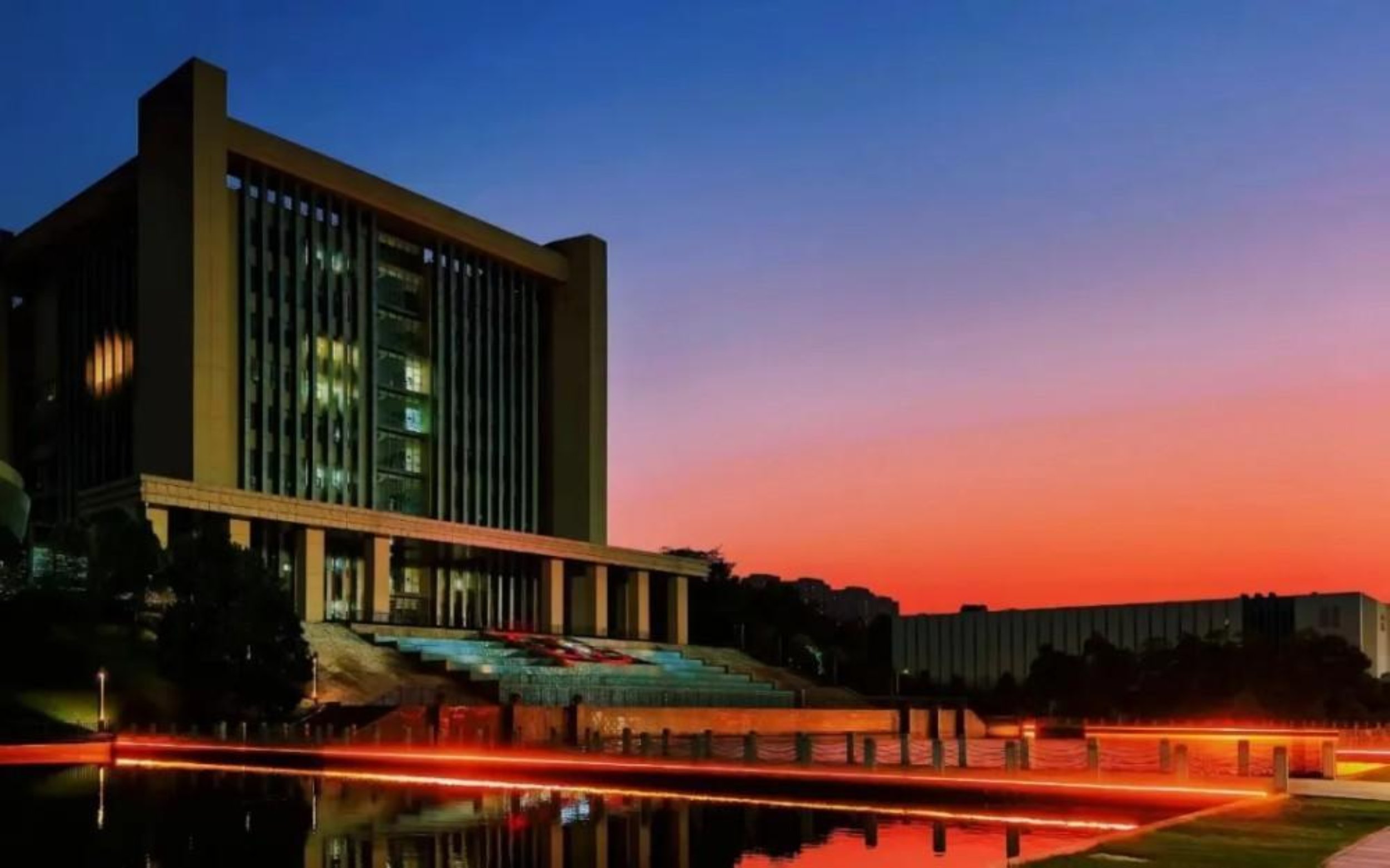 暮色轻笼,306实验大楼在霞光中静立。晚霞将天际晕染成橙红与靛蓝的交织,水面如镜,倒映着楼的轮廓与流光。灯光与暮色交融,勾勒出一幅静谧而温暖的画面,仿佛时光在此刻缓缓停驻。