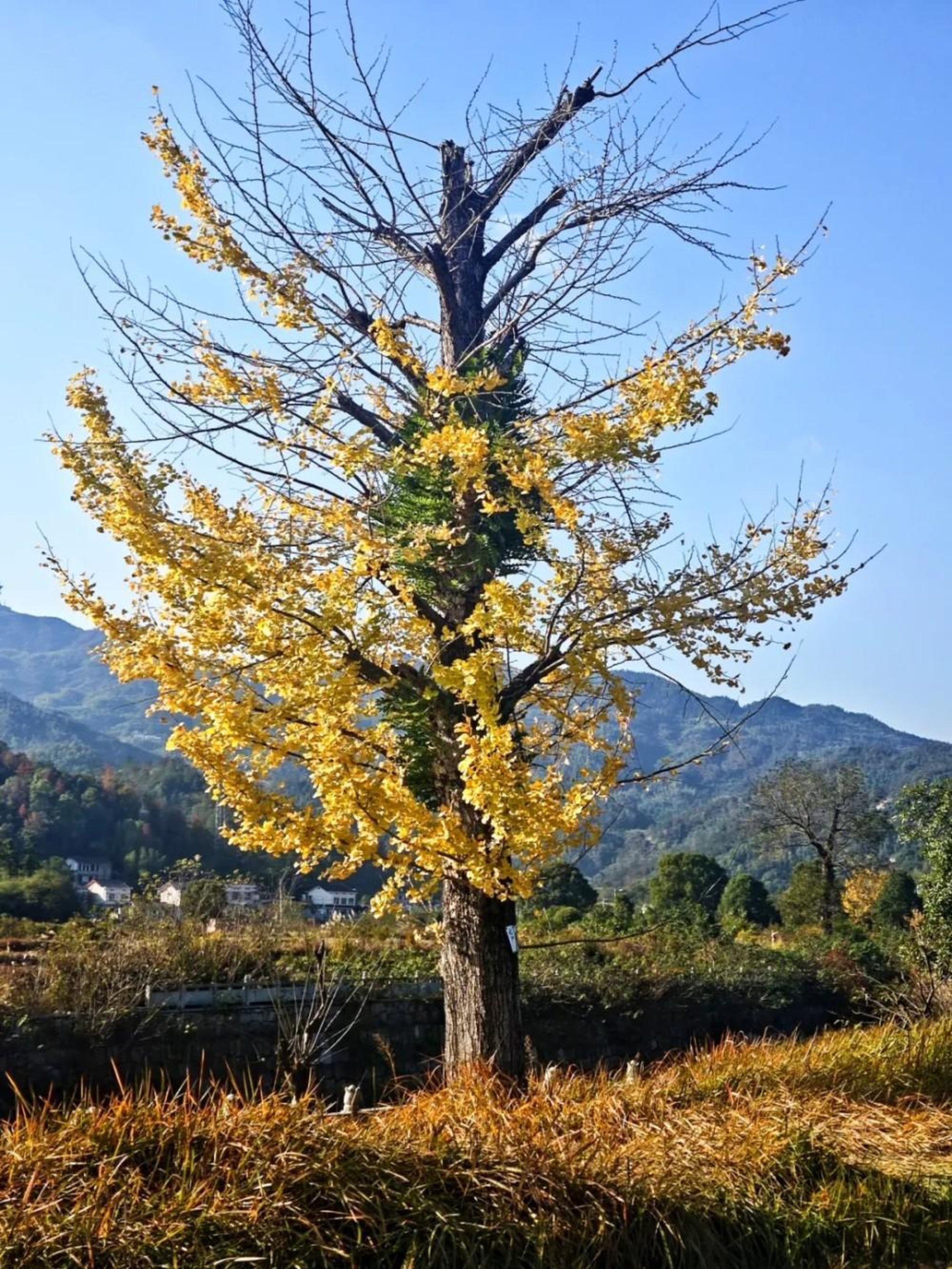 军事地形学课里对地物的定义很明确:是地表面的固定物体,涵盖自然形成与人工建造两类。而在地形学实践课的山野间,这株银杏成了最生动的自然地物范本——沧桑树干撑着半枯疏枝,余下枝桠却漫裹金叶,秋阳里亮得暖而鲜活;脚下枯草染黄,远山叠黛,乡居隐于林后,它把秋的温软嵌进山野轮廓。金叶间藏着新绿,新旧交替里裹着生生不息的劲儿,这大抵是实践课上见过的最美地物。