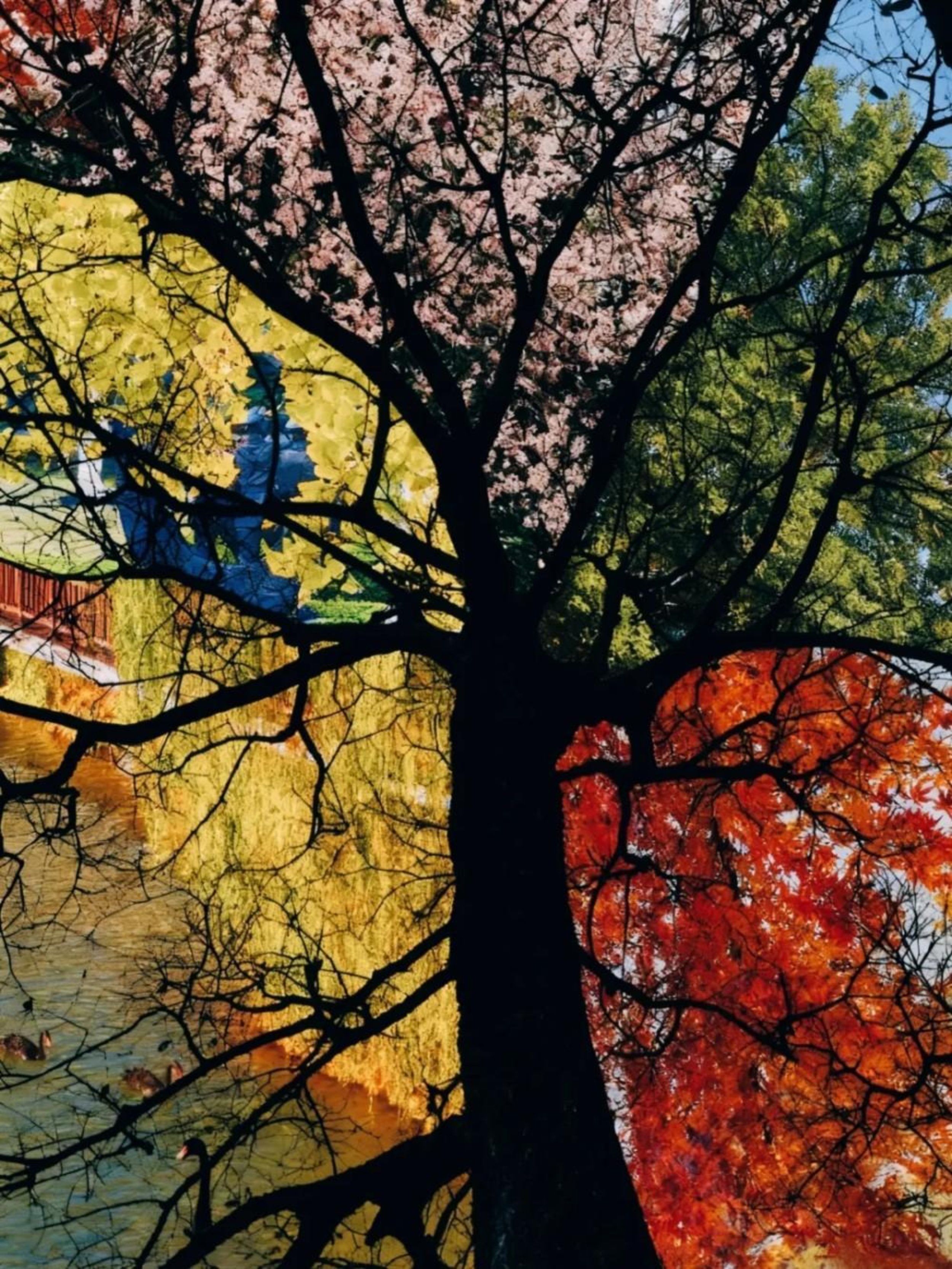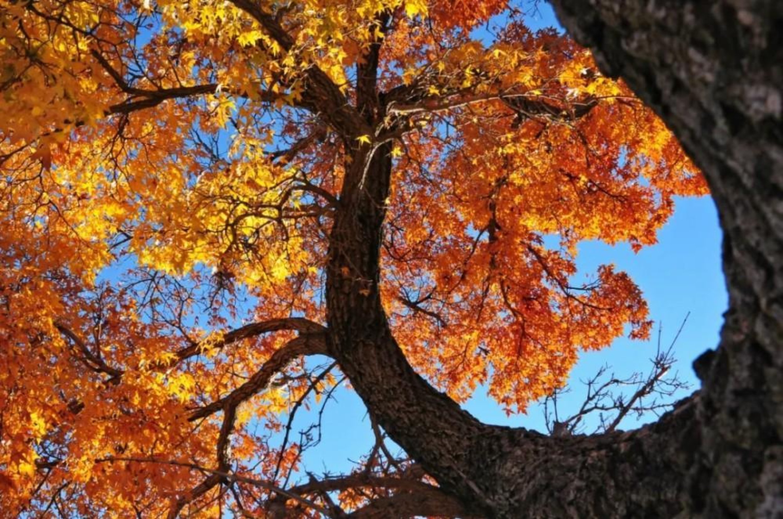 透过树干的天然 “画框”,金黄秋叶在蓝天背景下绽放炽热。虬曲枝桠如岁月蚀刻的脉络,叶片层次分明,光影交错间,秋的绚烂与树的苍劲交融,勾勒出一幅通透而磅礴的季节颂歌。