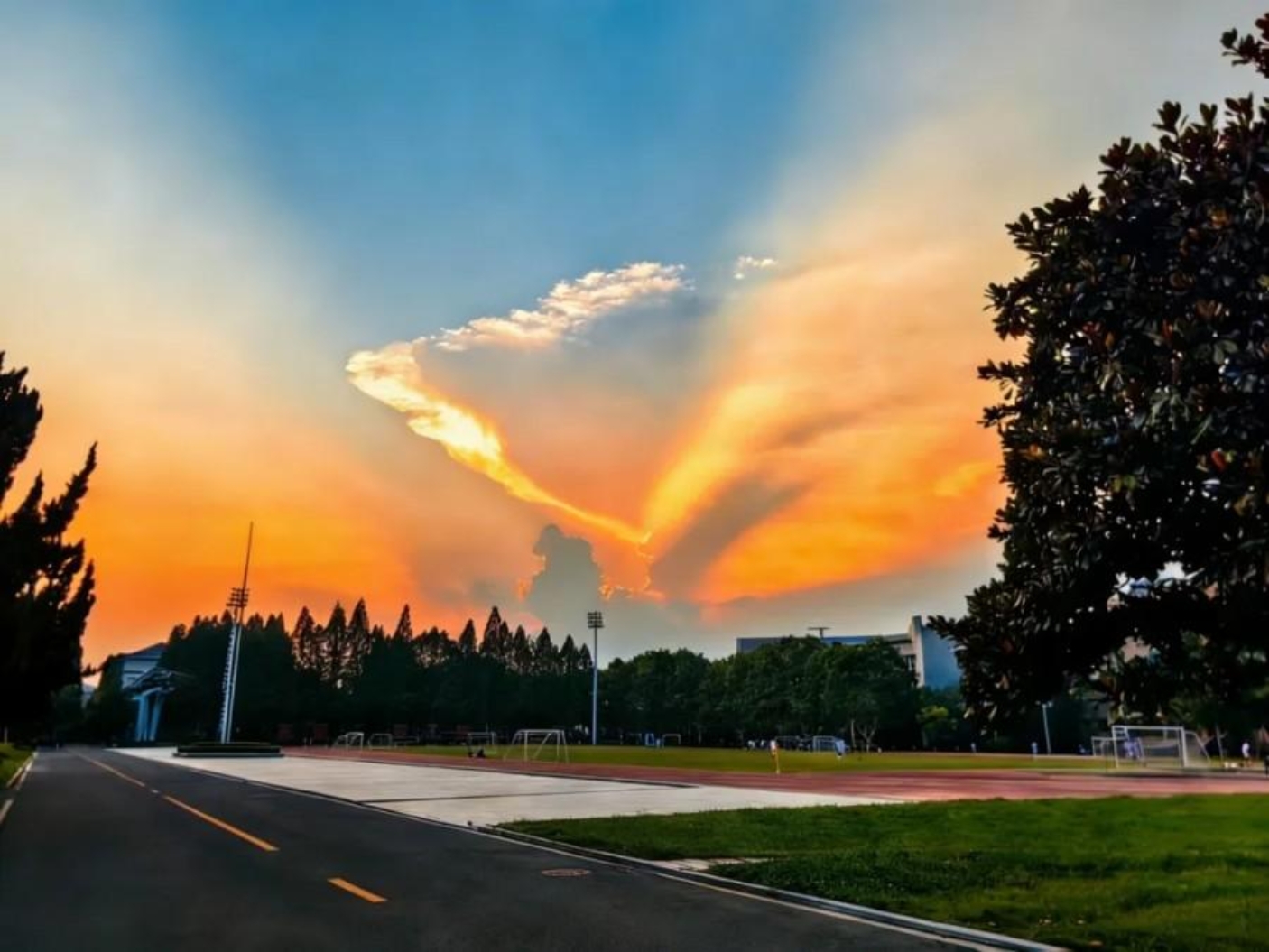 校园运动场的暮色里,霞光勾勒出云间凤凰的轮廓,丁达尔光如金翼舒展。晚风裹着青草的气息掠过跑道,流云缓缓与光影相拥,霞光漫染天际与操场相映成画,远处传来零星的笑语渐渐消散,看台边的梧桐叶在微风中轻轻摇晃,光影交织间,定格这高地独有的奇幻瞬间。