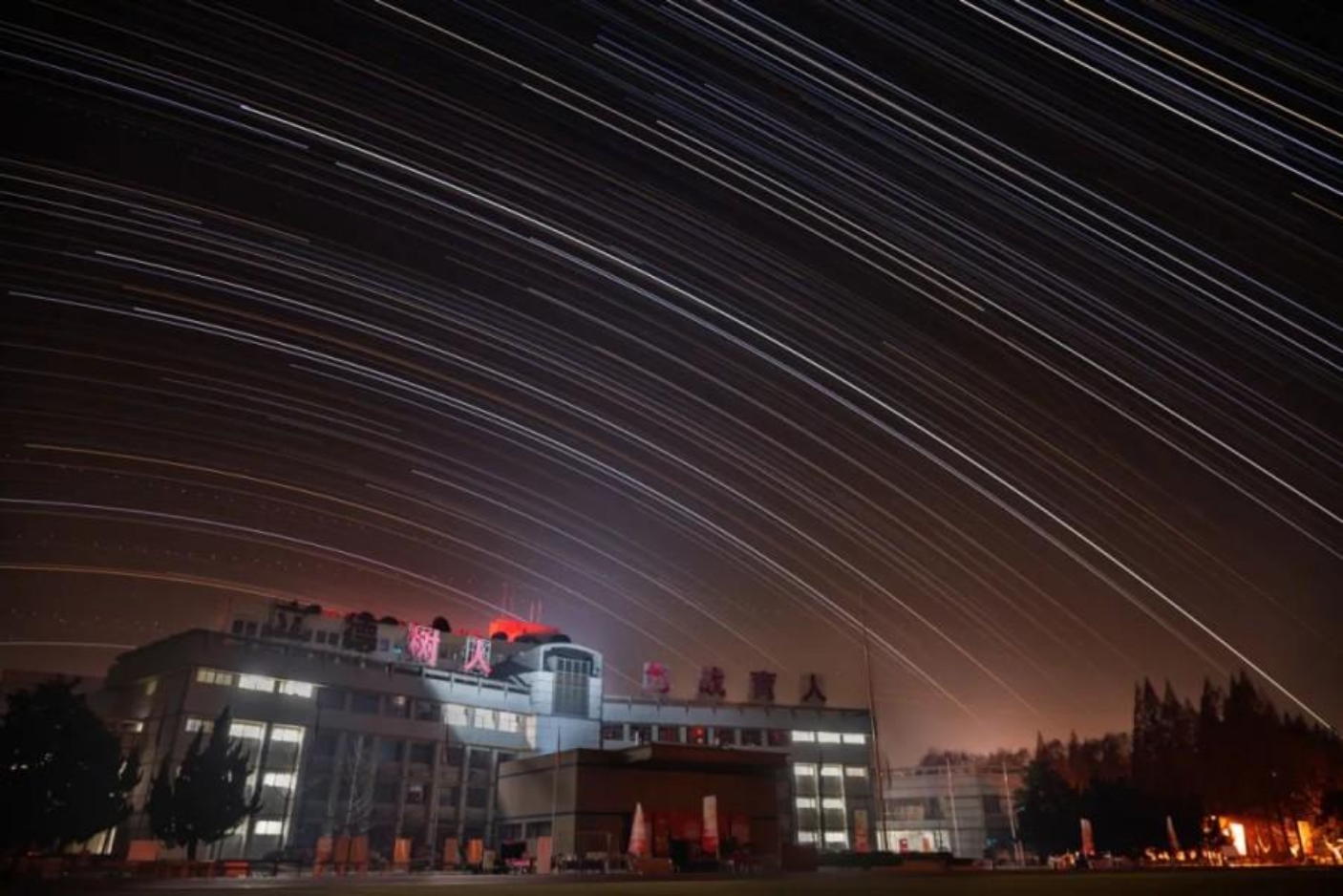 夜幕如墨,丝缕般的星轨以北极星为中心,交织成巨大的流动光网,覆过建筑的轮廓。楼下的建筑亮着暖光,窗棂透出温柔的光,与星轨的冷冽形成对比。流动的星痕是时间的私语,静止的建筑是岁月的锚点,两者在夜空中交汇,织成一幅静谧而有力量的画,仿佛在诉说时间与坚守的故事。