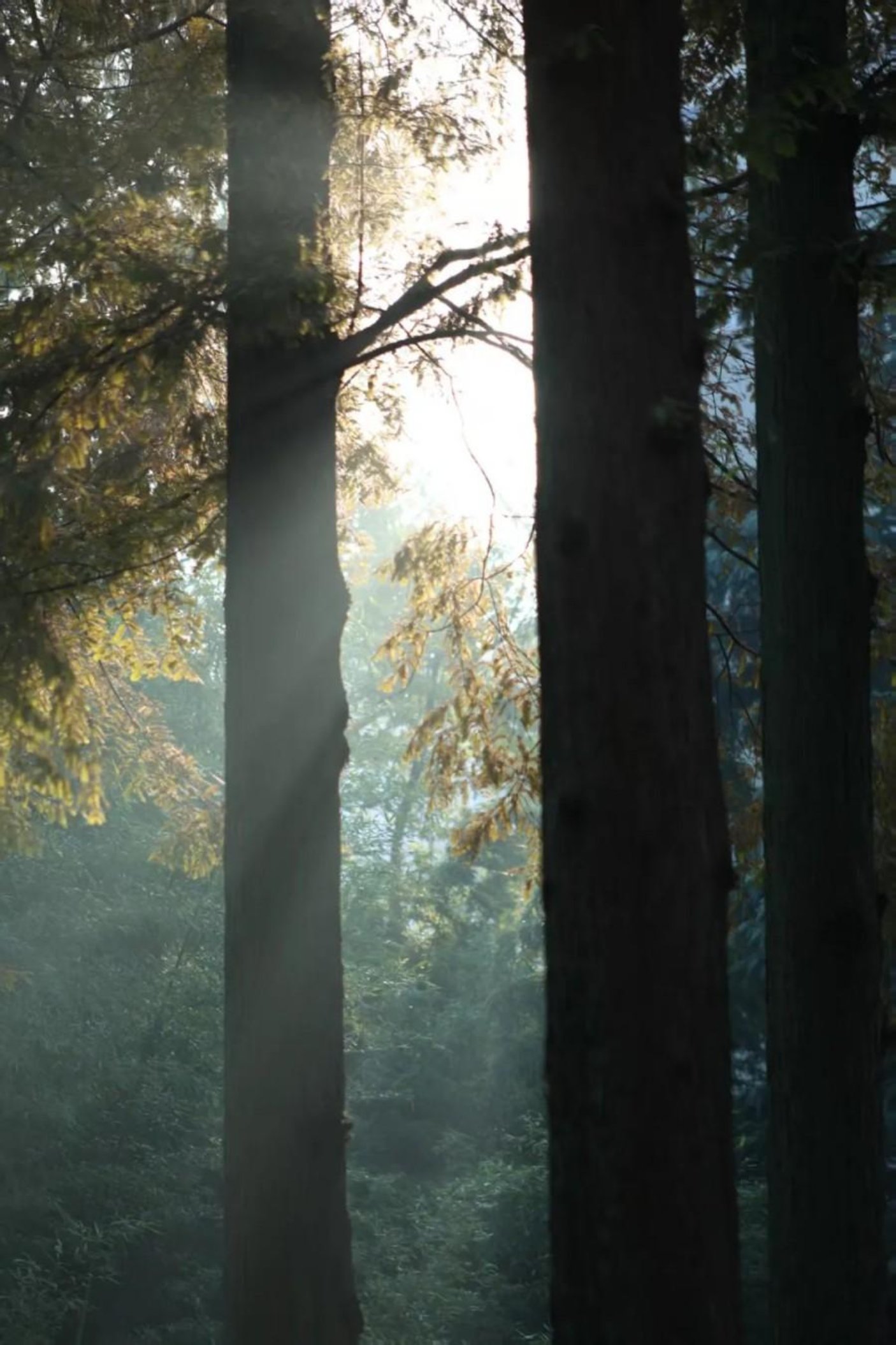 清晨的阳光穿透水杉林的枝叶,凝成一束束柔和的光柱,在薄雾里铺展成朦胧的光影画卷。树干的深褐与叶片的暖黄相映,光束似有生命般穿梭林间,添了几分灵动,仿佛能听见光与枝叶私语的温柔声响。