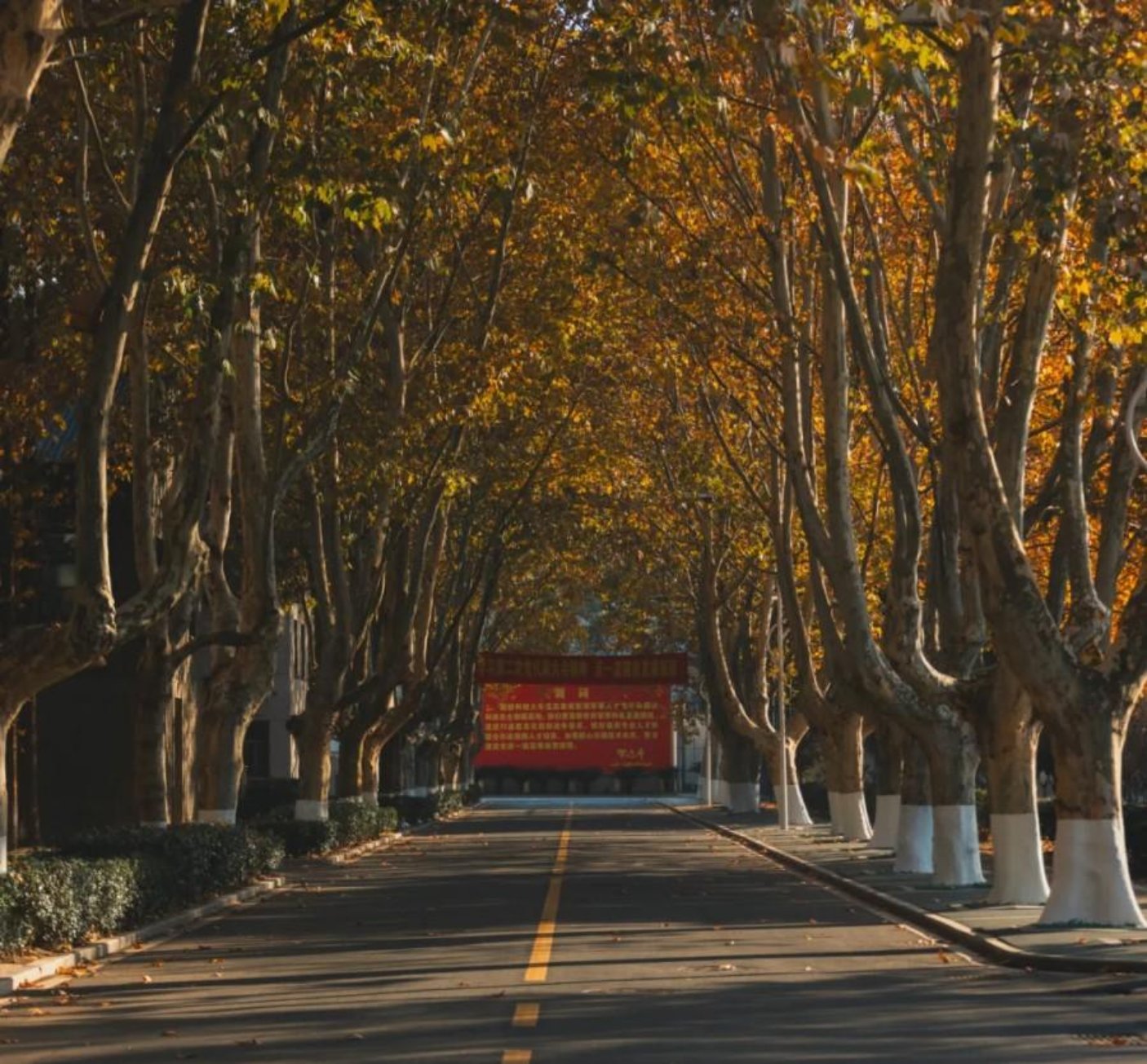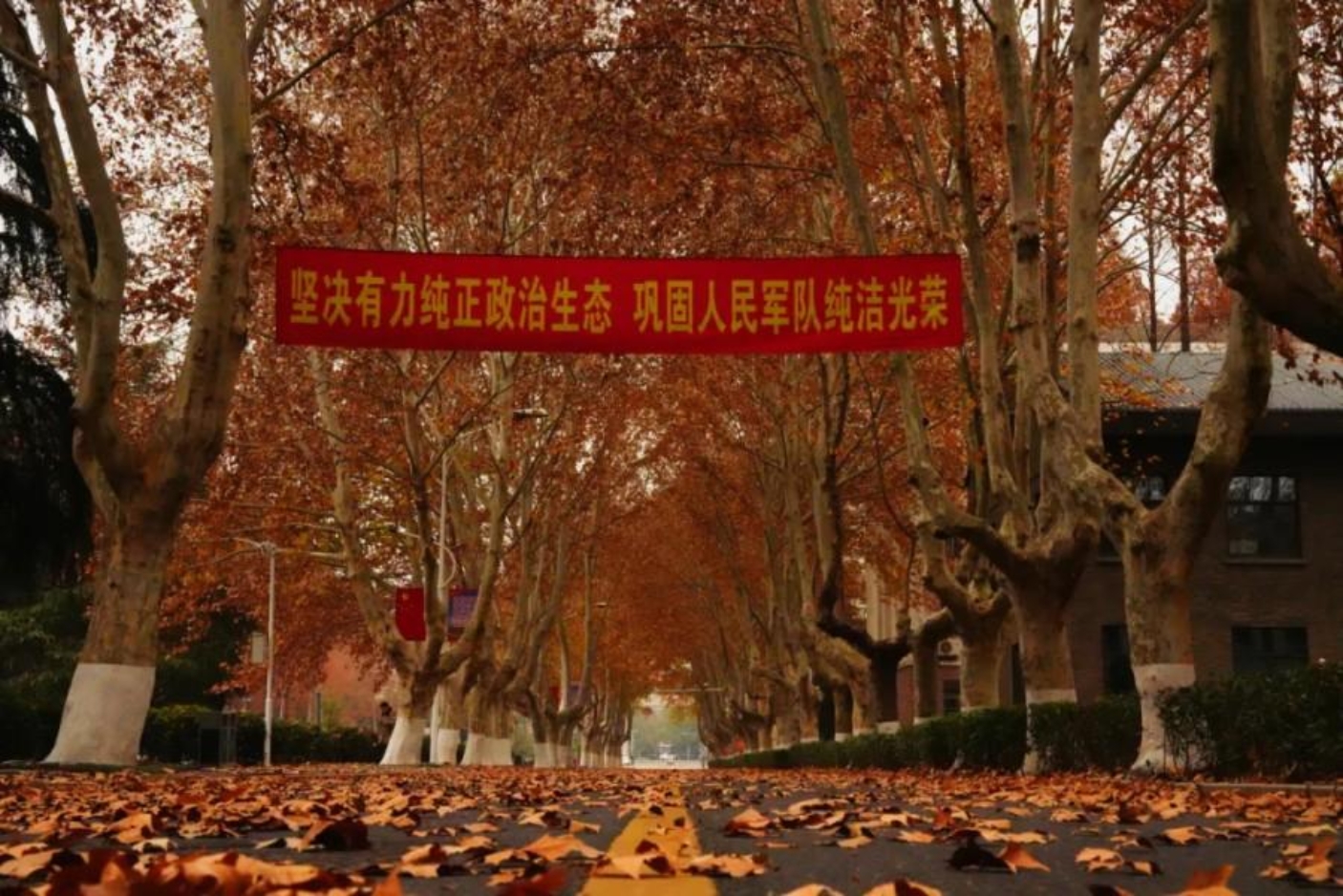 落日的余晖漫过校园的梧桐枝桠,金黄的叶片与笔直的树干相映,如戎装的战士整齐而列。路面的黄金线延伸向远方,尽头的红墙标语凝结着报国的初心,梧桐道的秋韵里,既有季节的温柔,更藏着独有的坚毅与荣光,每一片落叶都似在诉说着这里的家国情怀。