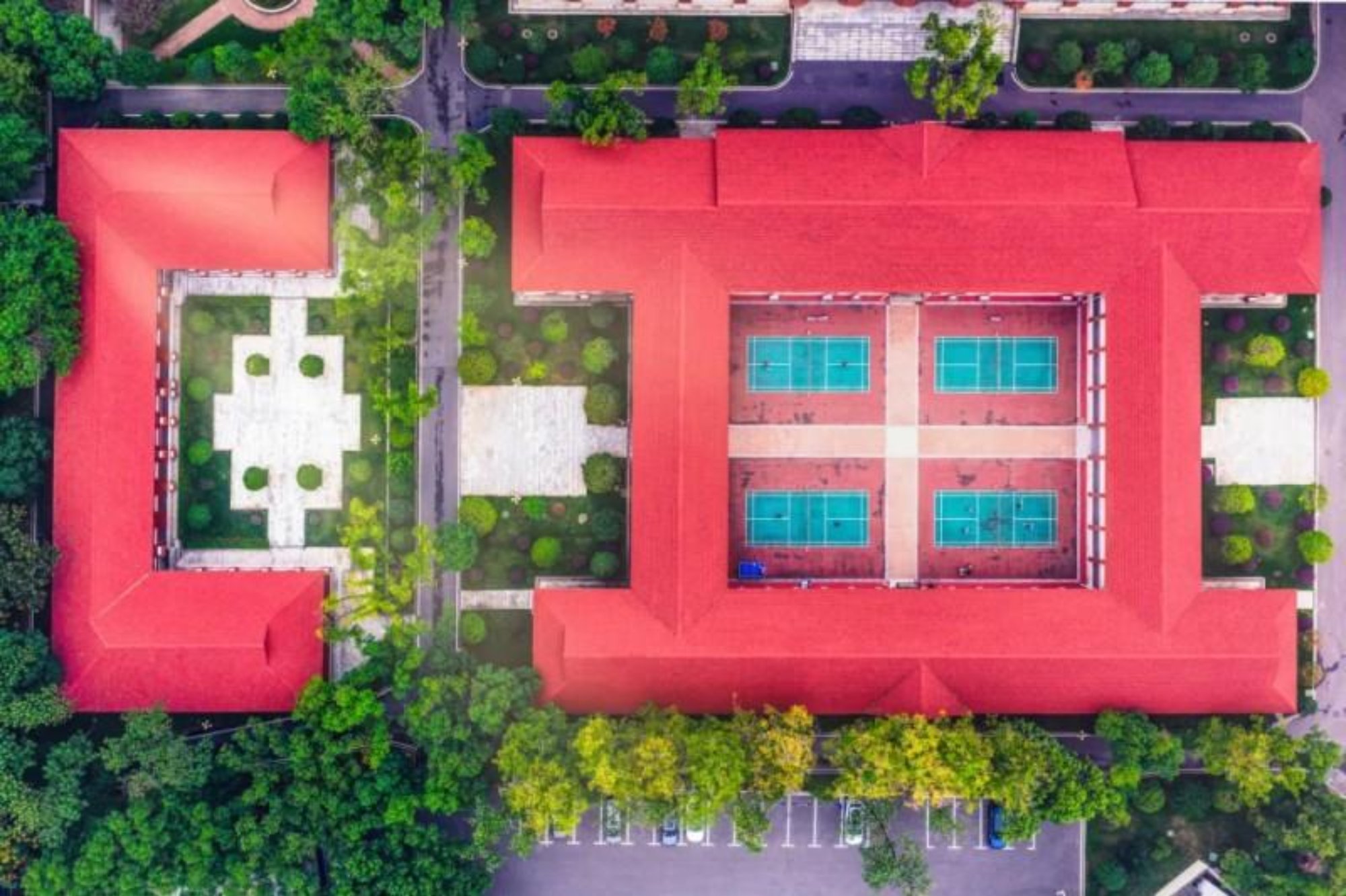 航拍视角下,院区景致如画。建筑连廊,规整道路,掩映绿树,写意成了“中国”的英文单词“China”。独具韵味的“回”字形“圈楼”占据了画面的大部,中间的空地上镶嵌着4个羽毛球场,仿佛看到一群充满活力的身影,正在这个传统与现代交融碰撞的学科交叉中心,以满腔热情投身强军伟业,映照出伟大祖国健步前进的壮阔征程。