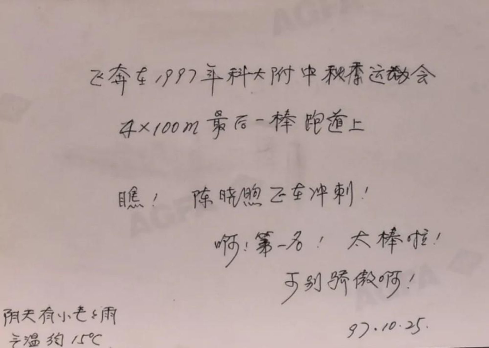 在陈晓煦珍藏的一张老照片背后,几行娟秀的字迹记录着她与这座田径场的故事:飞奔在1997年国防科大附中秋季运动会4x100米最后一棒的跑道上。照片是陈晓煦参加运动会时紧握接力棒,飞速往前冲的模糊身影。