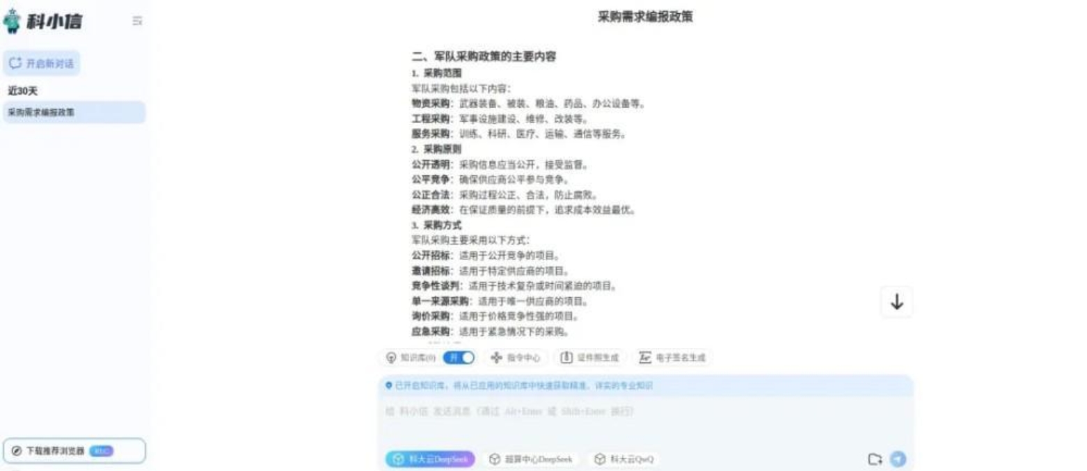 机关业务部门依托“科小信”上线采购业务机构库,全面覆盖相关法规政策和常见问题,方便用户信息查询、获取帮助指引,采购工作中遇到的问题能够得到快速精准的回答。优化采购流程,减少文件审批环节,缩短各节点时间,采购质效明显改善。