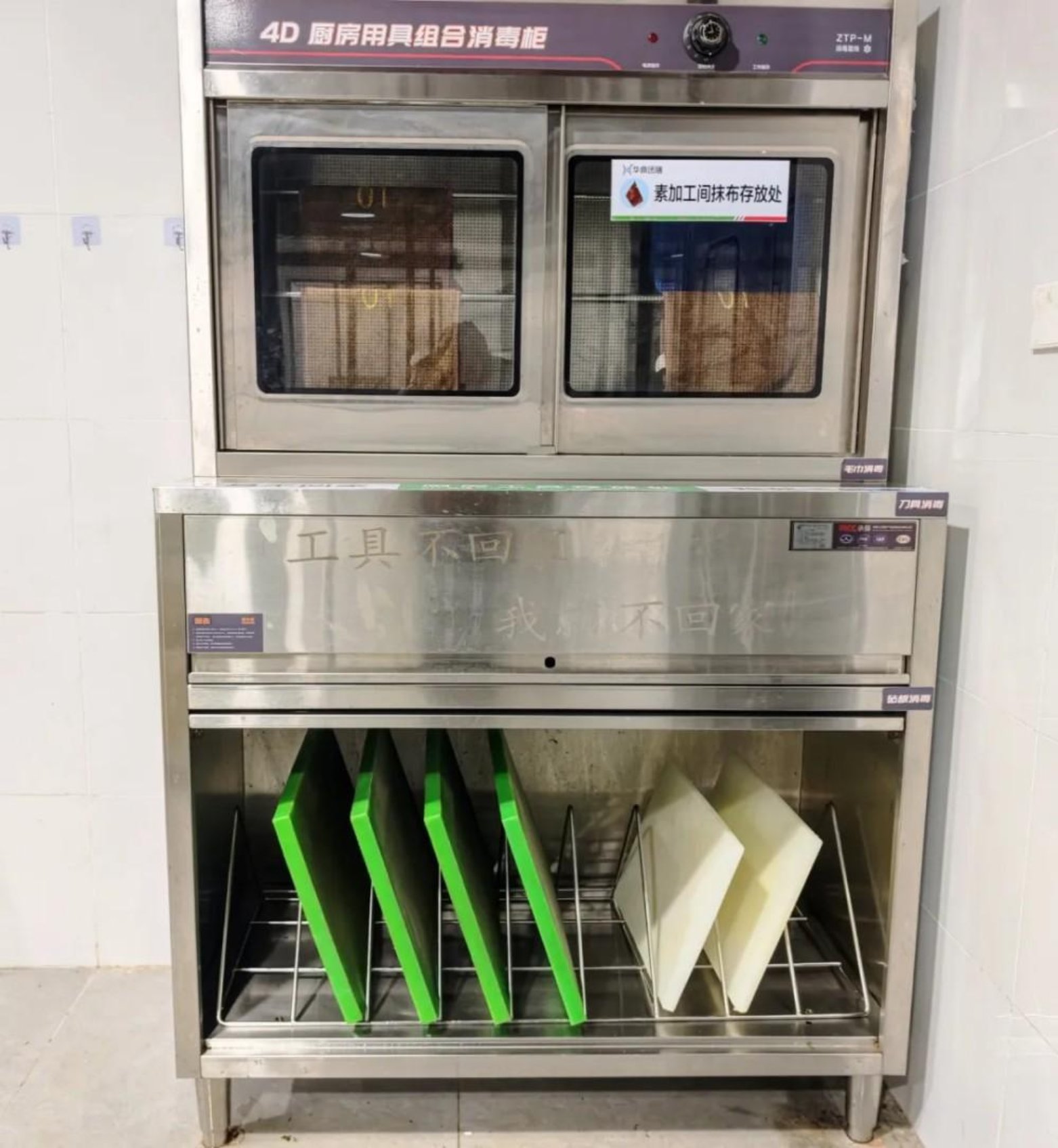 走进学校食堂后厨,不难发现这样一个小细节——砧板和刀具都佩戴了颜色各异的“身份证”:红色处理肉类、蓝色处理水产、绿色处理素菜、白色处理熟食……