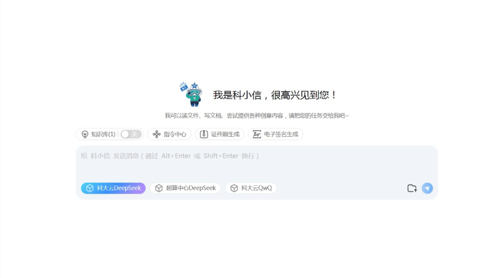 学校自主开发用户交互系统即“科小信”智能问答机器人,完成DeepSeek等国内知名大模型的本地化部署,支持文档解析、对话管理和用户管理、构建个人/机构知识库管理系统等功能,集成于网上办事大厅,更多信息化服务欢迎咨询科小信,愿它能成为您工作学习的得力助手。