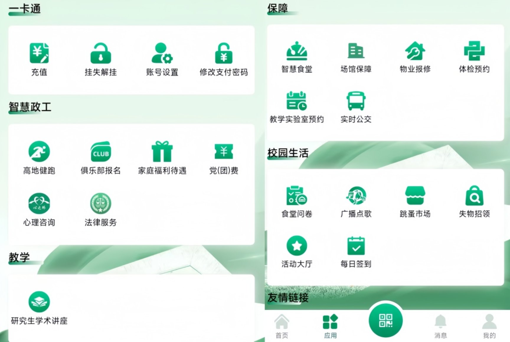 主要功能包含:校园一卡通、研究生学术讲座、教学实验室预约、场馆预约、物业报修、实时公交、俱乐部报名、心理咨询等。