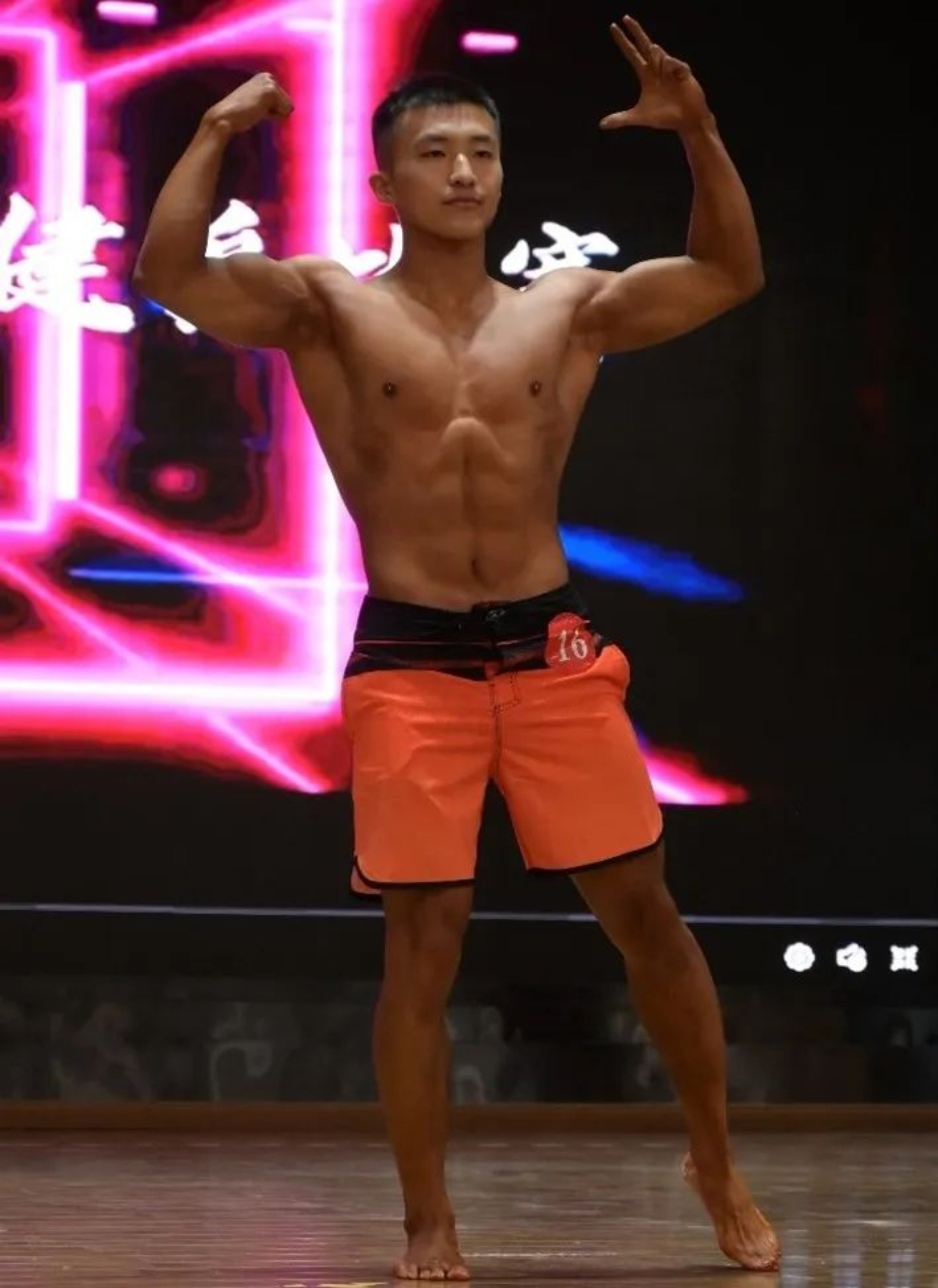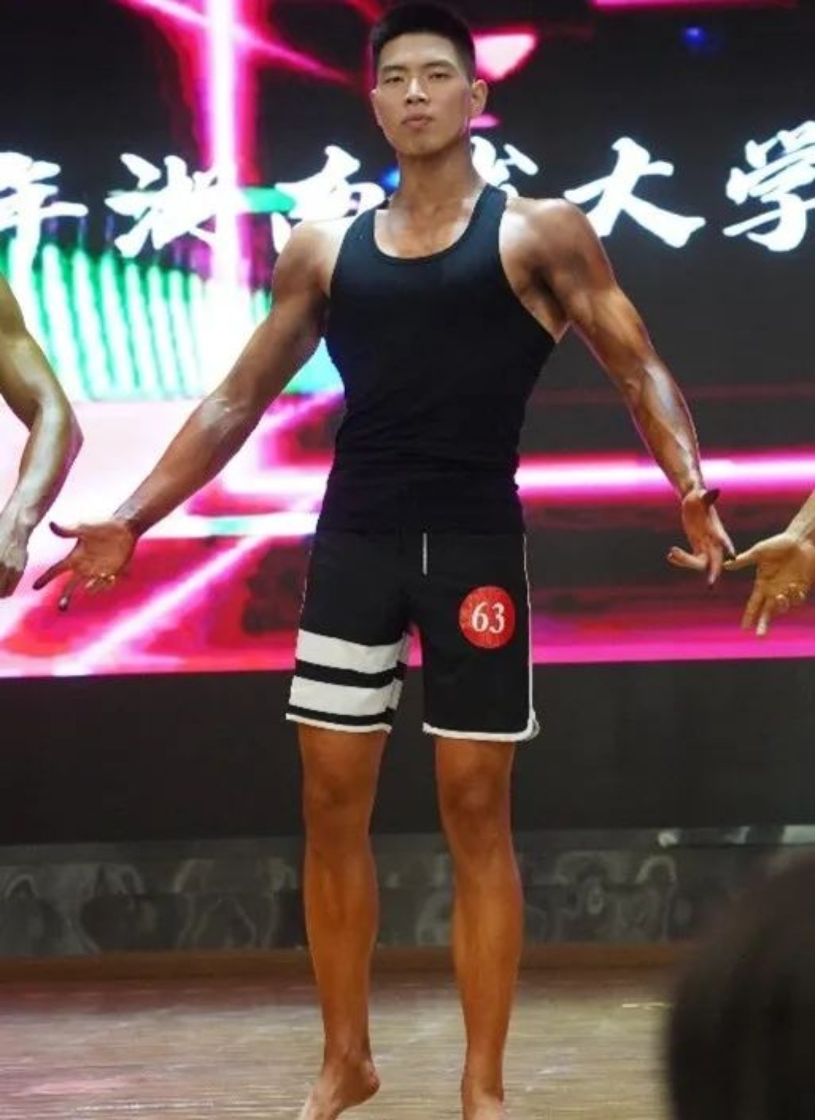 在大学A组的健体比赛中,健身3年的薛亮脱颖而出,凭借着丰富的舞台经验,健硕的肌肉在油彩和灯光的陪衬下迸发着力量的美感,获得了评委的高度评价。