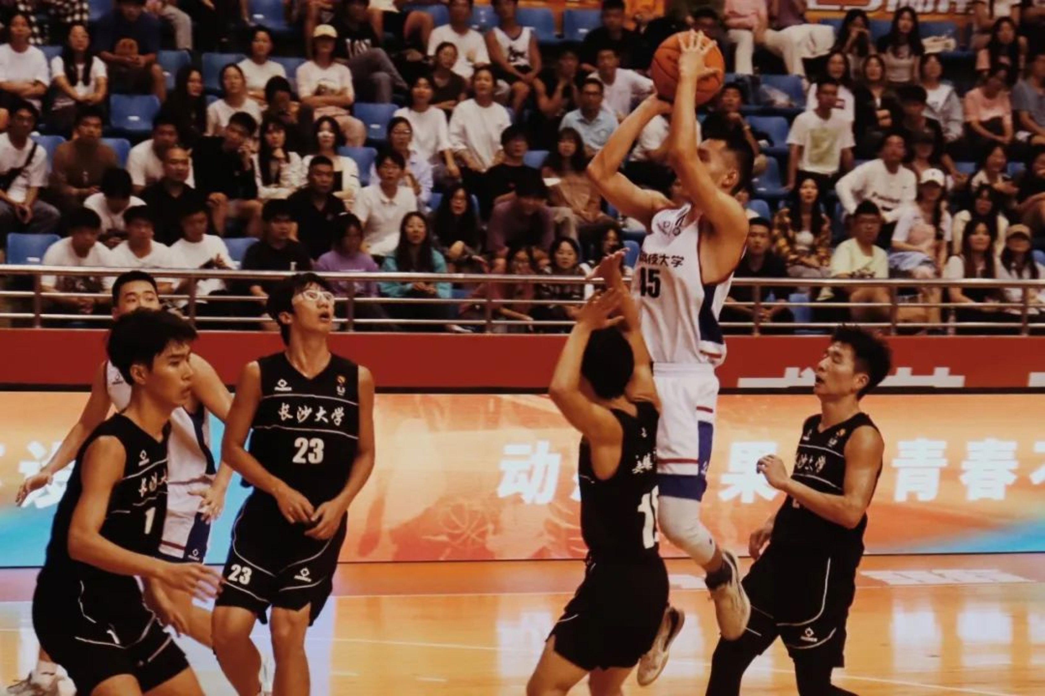 易边再战,湖南工商大学下半场及时调整阵容吹响反攻号角,一度反超比分。教练刘彬及时安排对应战术,队员们强势给予回应,双方比分交替上升。决胜时刻,队员刘景浩一记底线三分,投进关键一球。
