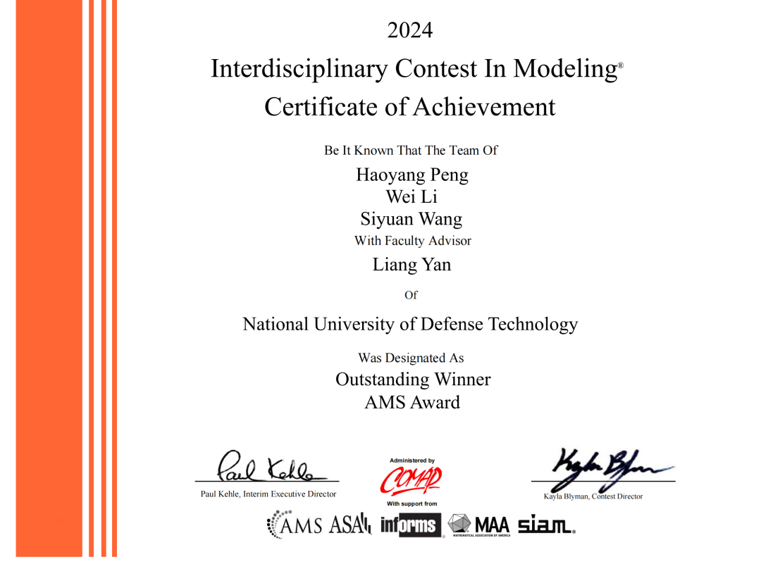 近日,第四十届国际大学生数学建模竞赛成绩揭晓,来自beat365平台唯一官网理学院2021级军人本科学员彭浩洋、李伟、王思远组成的团队获得竞赛最高奖特等奖,并获国际数学学会冠名奖。此外,学校参赛队还获得特等奖提名奖8项,一等奖27项,二等奖88项,获奖成绩和获奖数量创参加该项赛事历史之最。