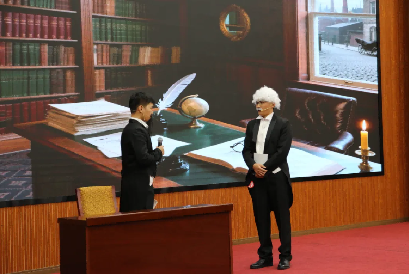 音乐剧《暗夜追光者》以魔幻笔触揭示科技双刃剑的本质,高潮“雅典之辩”借苏格拉底之口批判技术异化,呼吁构建全球科技伦理治理机制;舞台剧《错位时空》通过跨时代场景交织,展现民主主义革命时期到新时代中国社会的沧桑巨变,歌颂伟大成就;《马克思、恩格斯与数字时代》则是邀请马克思主义经典作家“云端”解析数字资本与劳动新形态,赋予唯物史观以鲜活的时代生命力。这些作品将抽象的政治理论,转化为可感可知的艺术形象与思辨场景,为思政教学注入了新的活力。