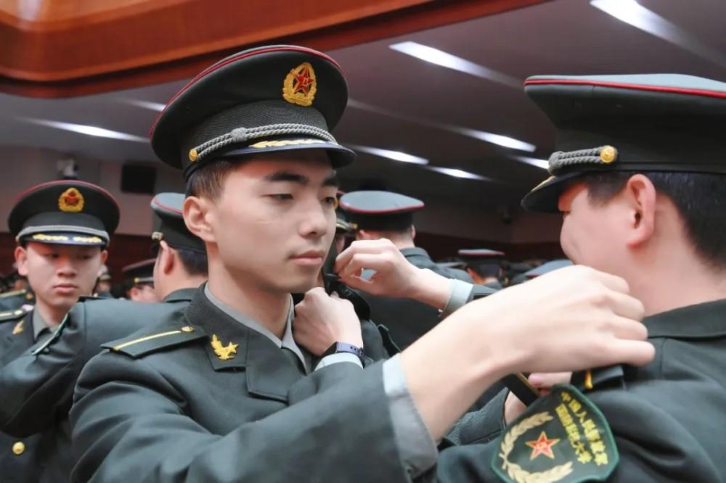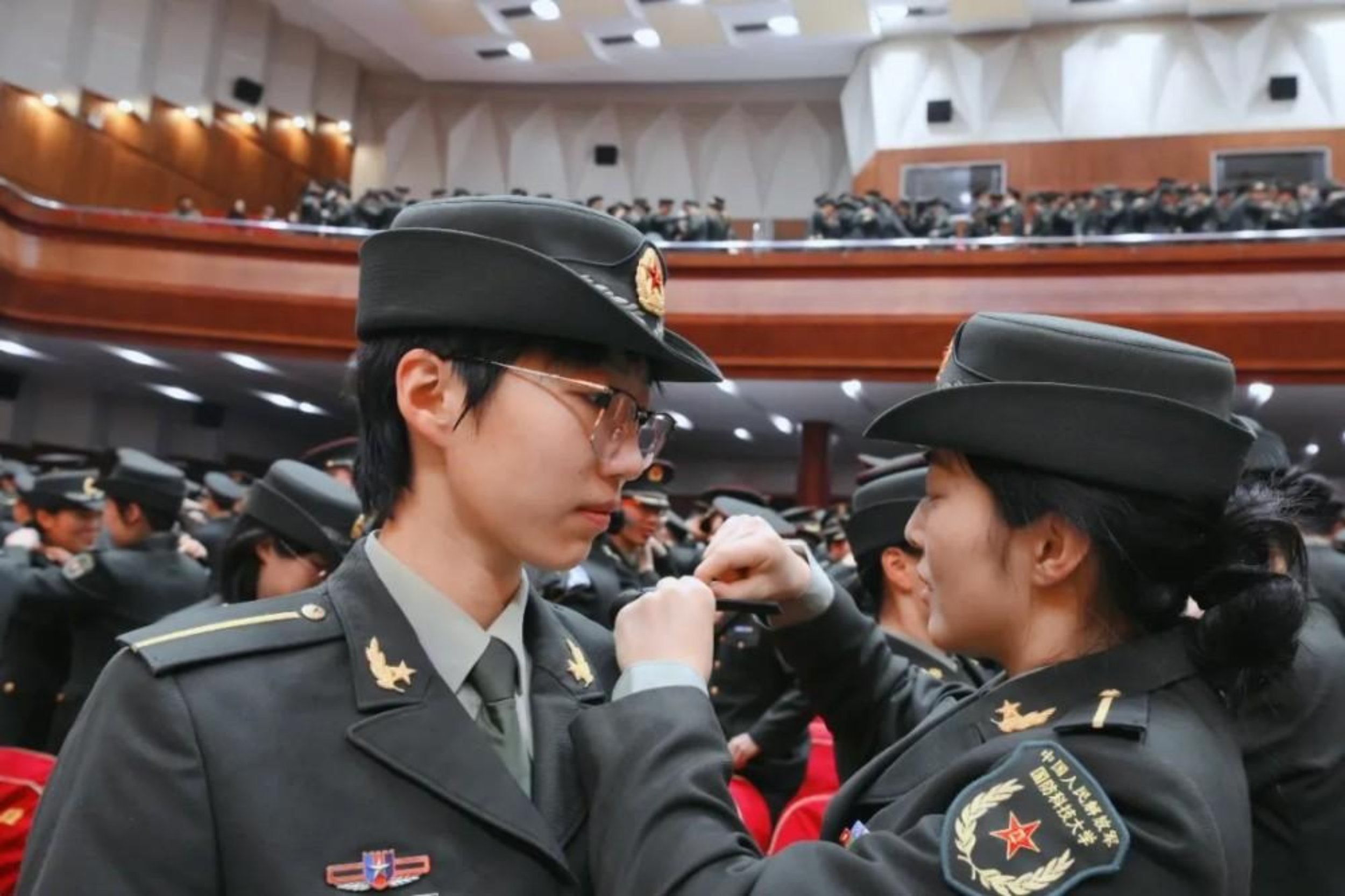 八一军徽的光芒下,一场特殊的“交接”正在进行——新授衔学员相互佩戴军衔。应届直读硕士学员告别“一道杠”的青春,开启“一颗星”的征程;直招入伍硕士、博士学员则在“一颗星”“两颗星”的肩头,扛起更为坚实的担当。