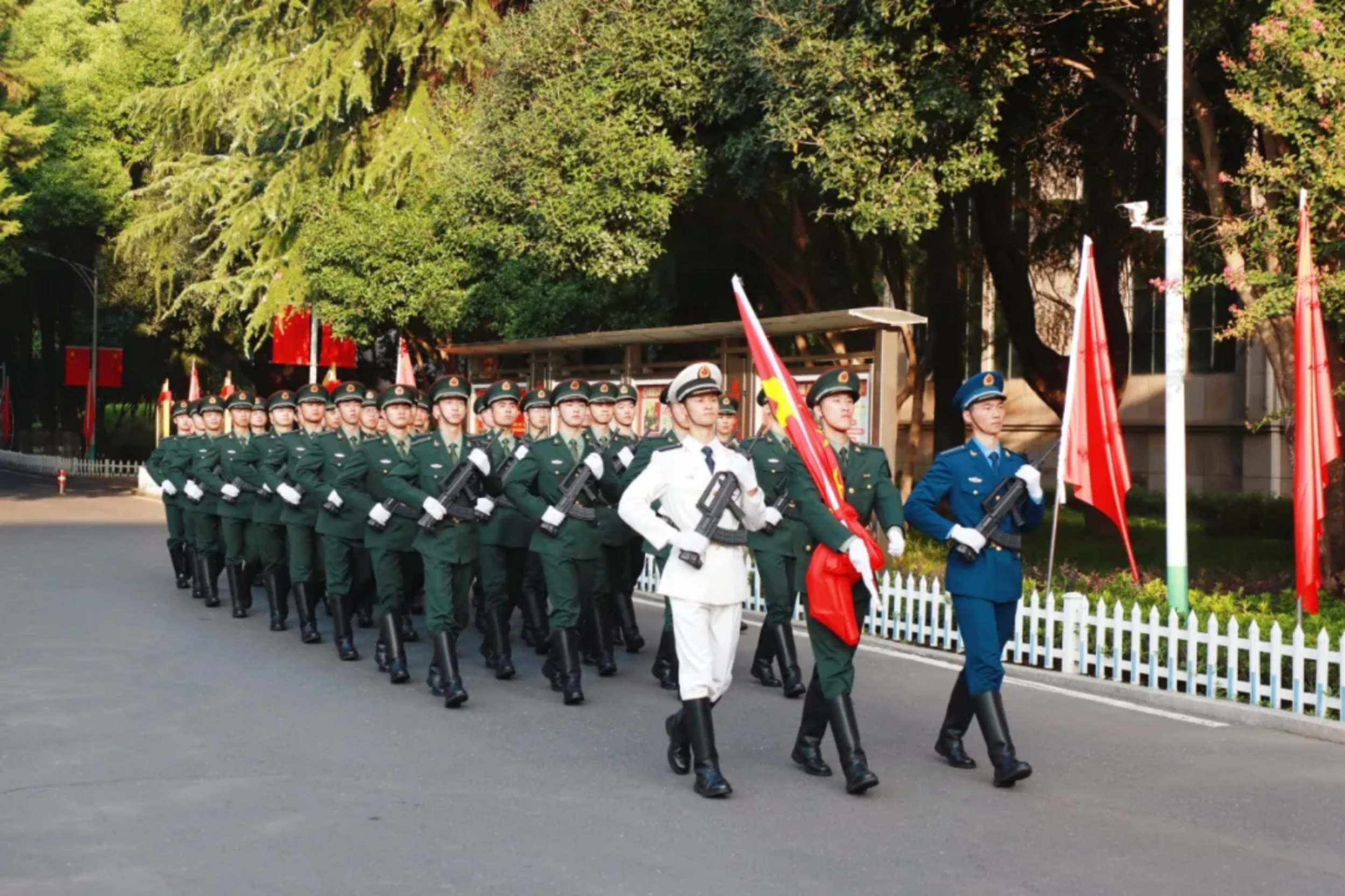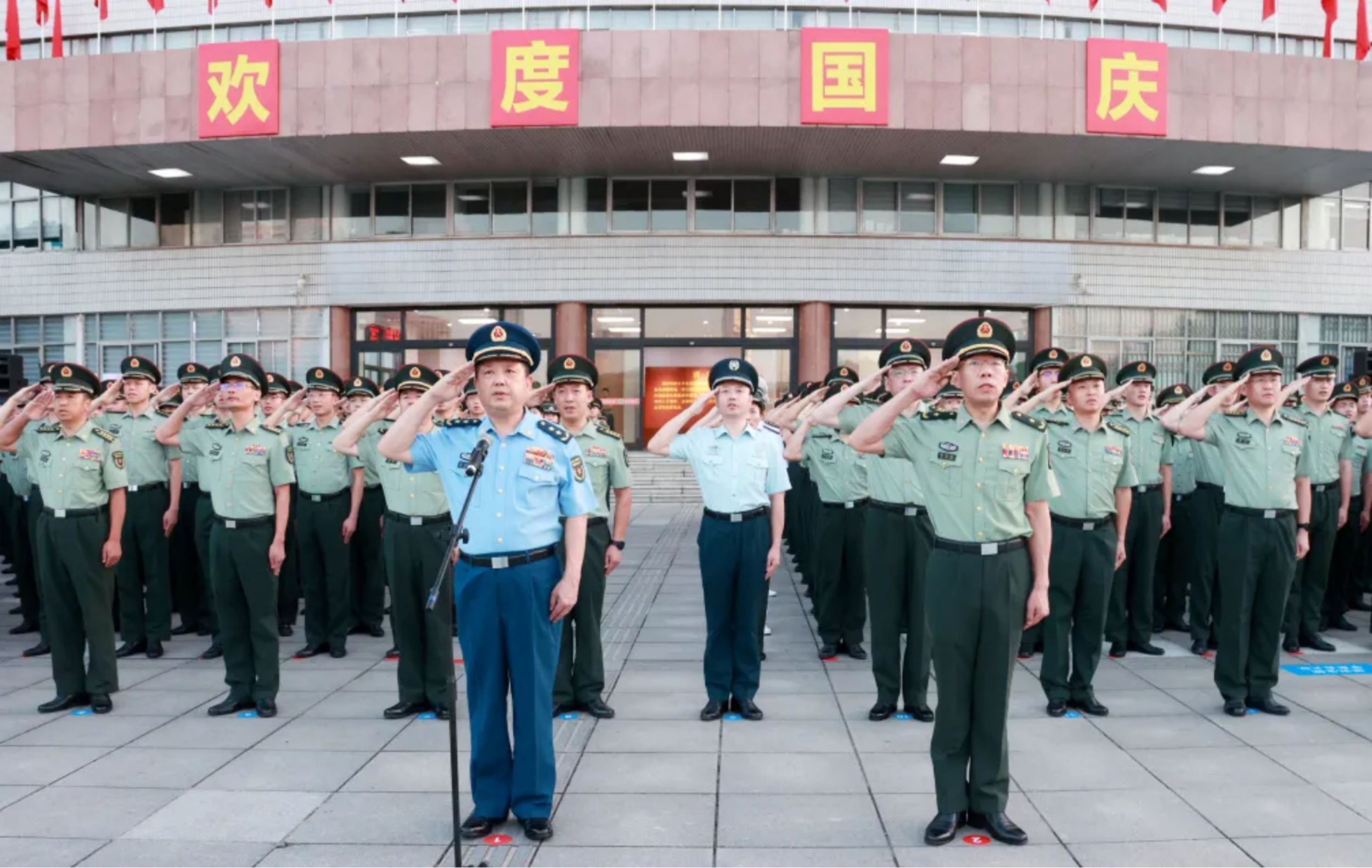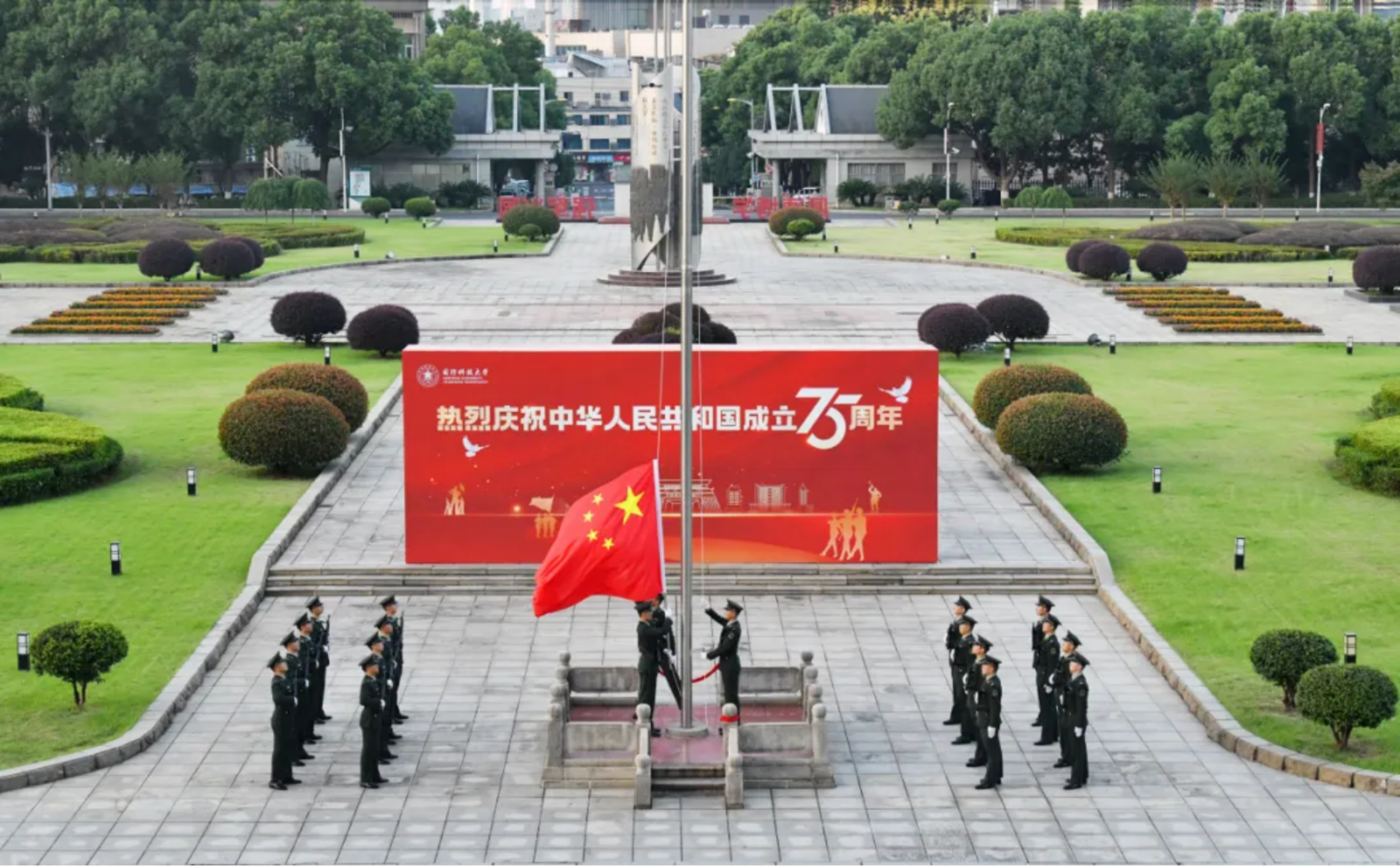 与国庆华诞,携手奏华章。电子对抗学院主干道两侧红旗招展,在中国红主元素点缀下的节日盛景分外喜人。伴随着《歌唱祖国》悠扬的旋律,护旗方队挂枪护卫国旗正步走向国旗台。随着鲜艳的五星红旗冉冉升起,全体师生员工无不坚定且深情地向国旗敬礼。