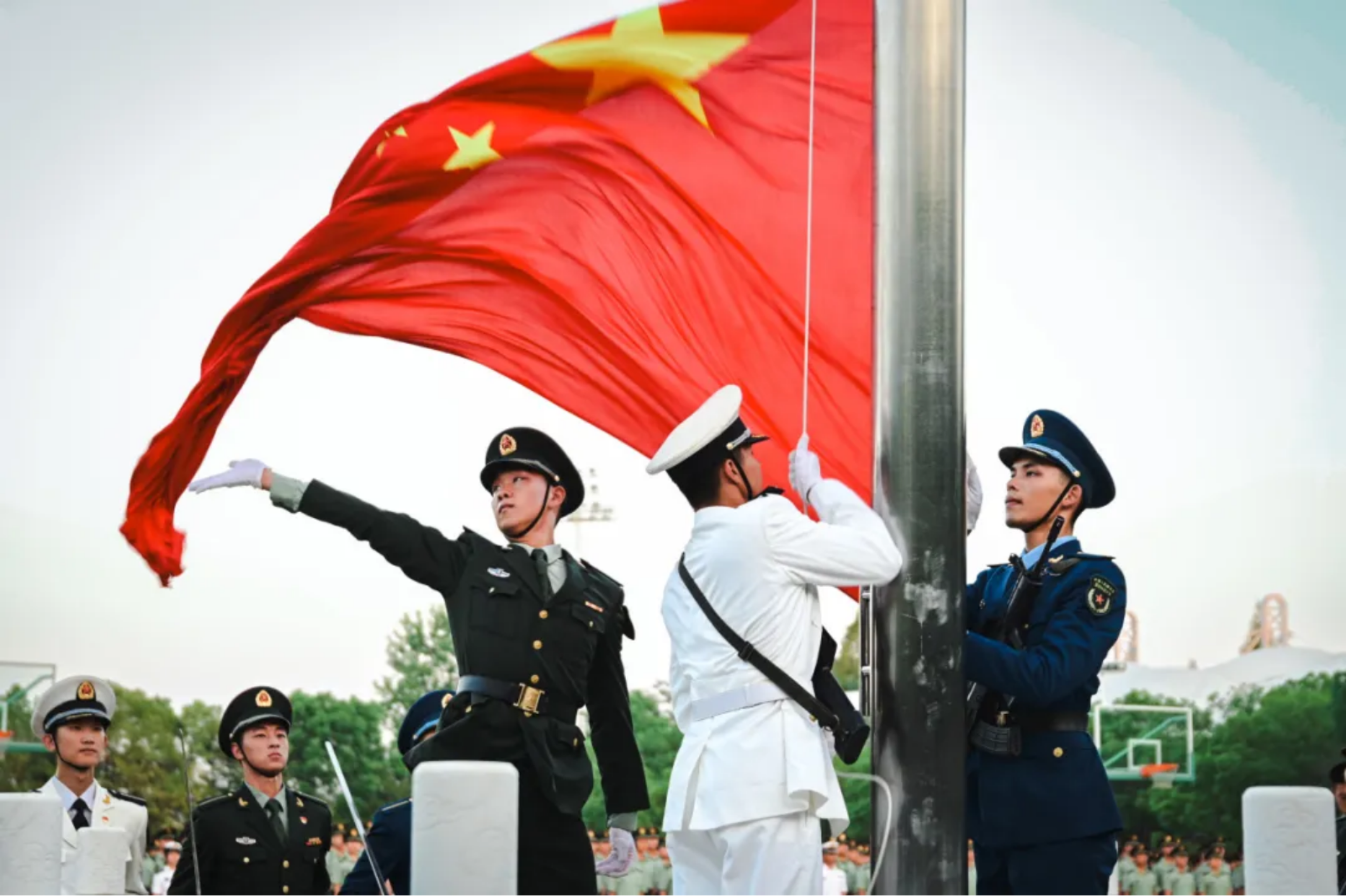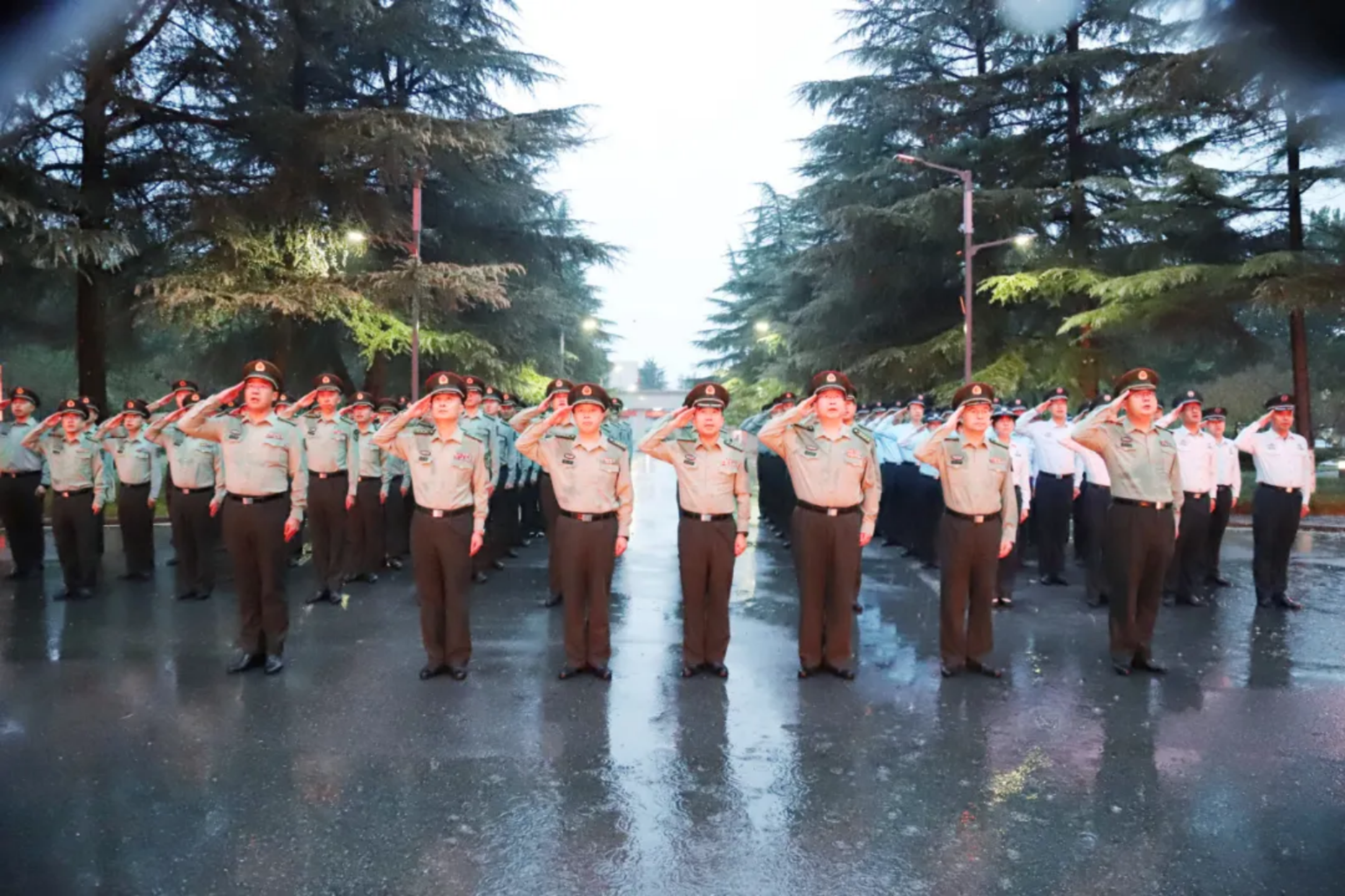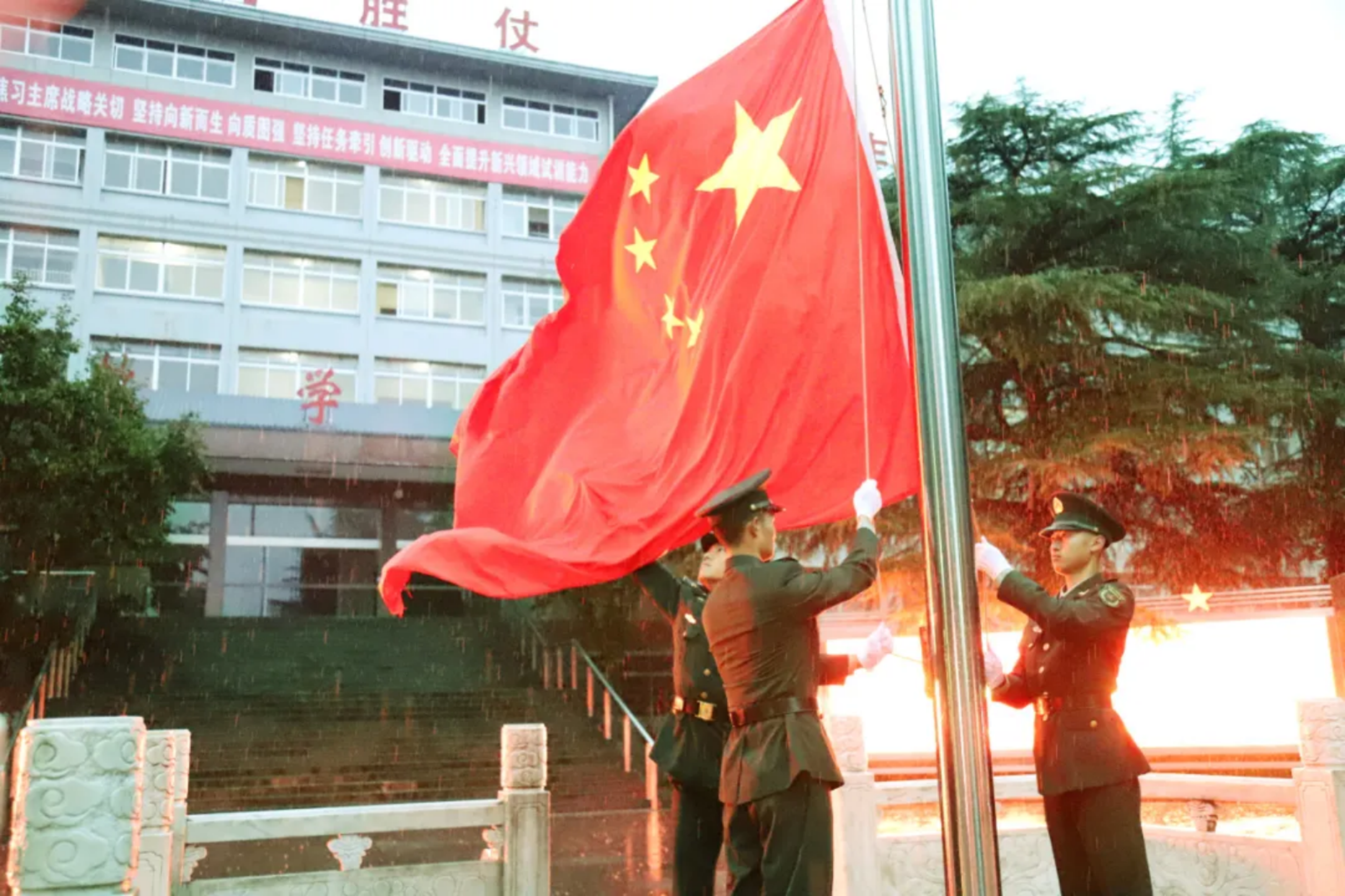 “起来,不愿做奴隶的人们……”雄壮激昂的歌声划破天空,响彻滈河水畔院区,鲜艳神圣的国旗冉冉升起,牵动队列里仰望的每颗心弦。试验训练基地全体官兵军容严整、目光坚定,五星红旗在雨中缓缓升起。
