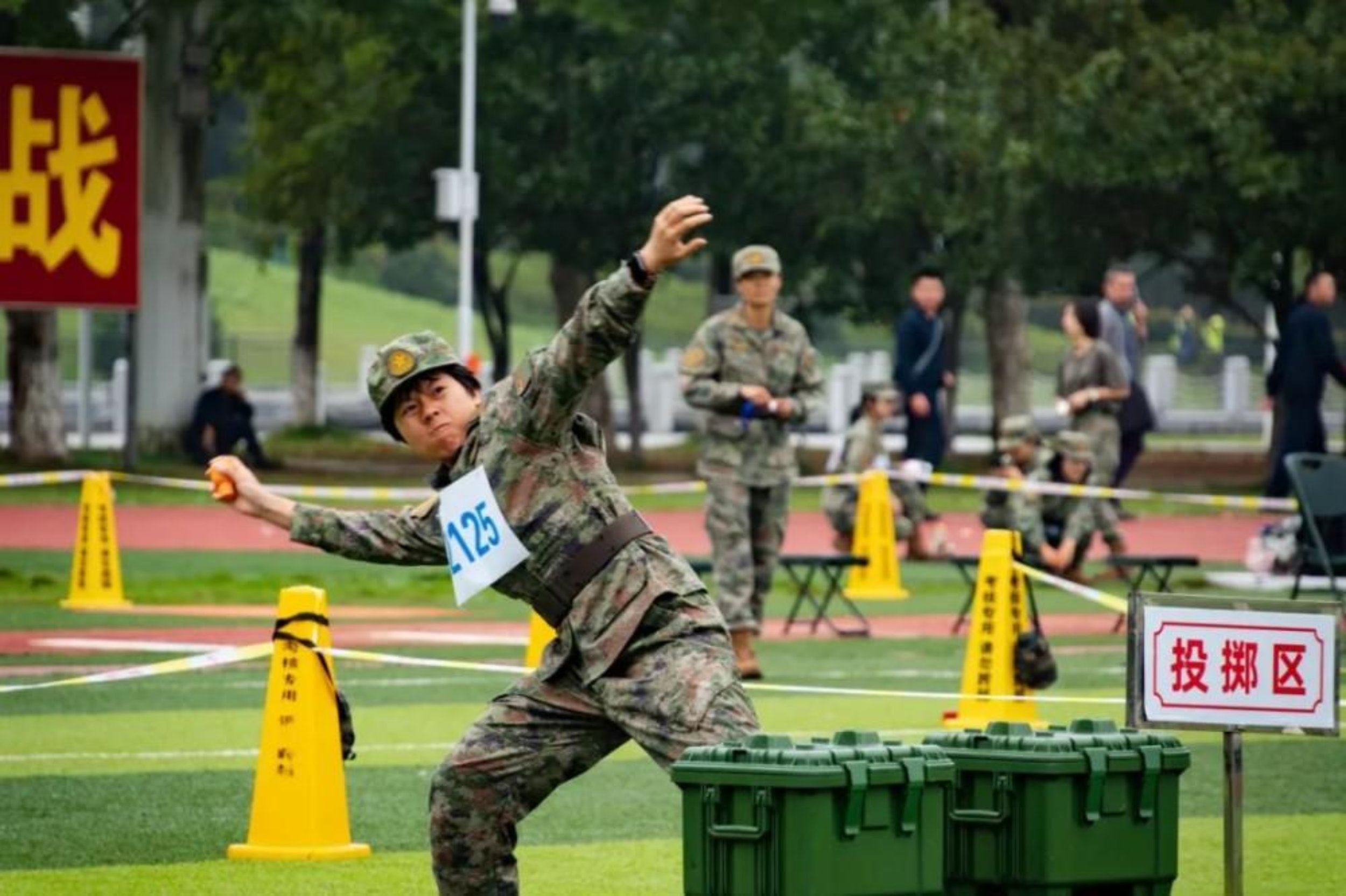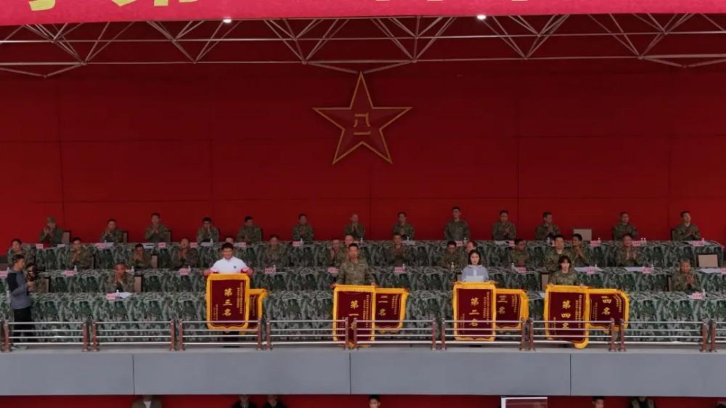 校领导为获奖单位颁奖。据悉,今年的系列赛事中,全校共有1552名运动员,参加62个田径项目、20个军事类项目和4个“奋进杯”项目,18人次创破校运会纪录。