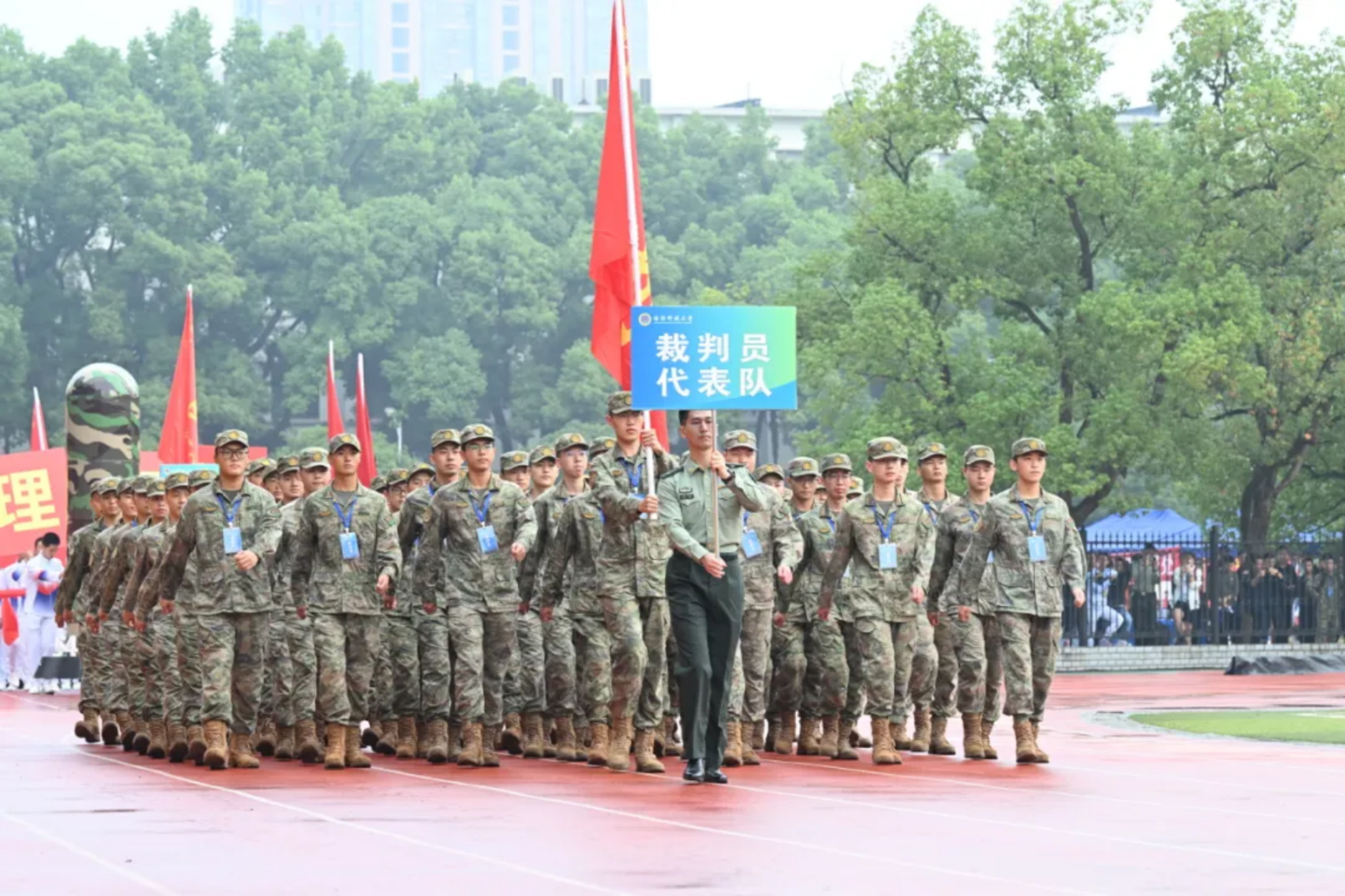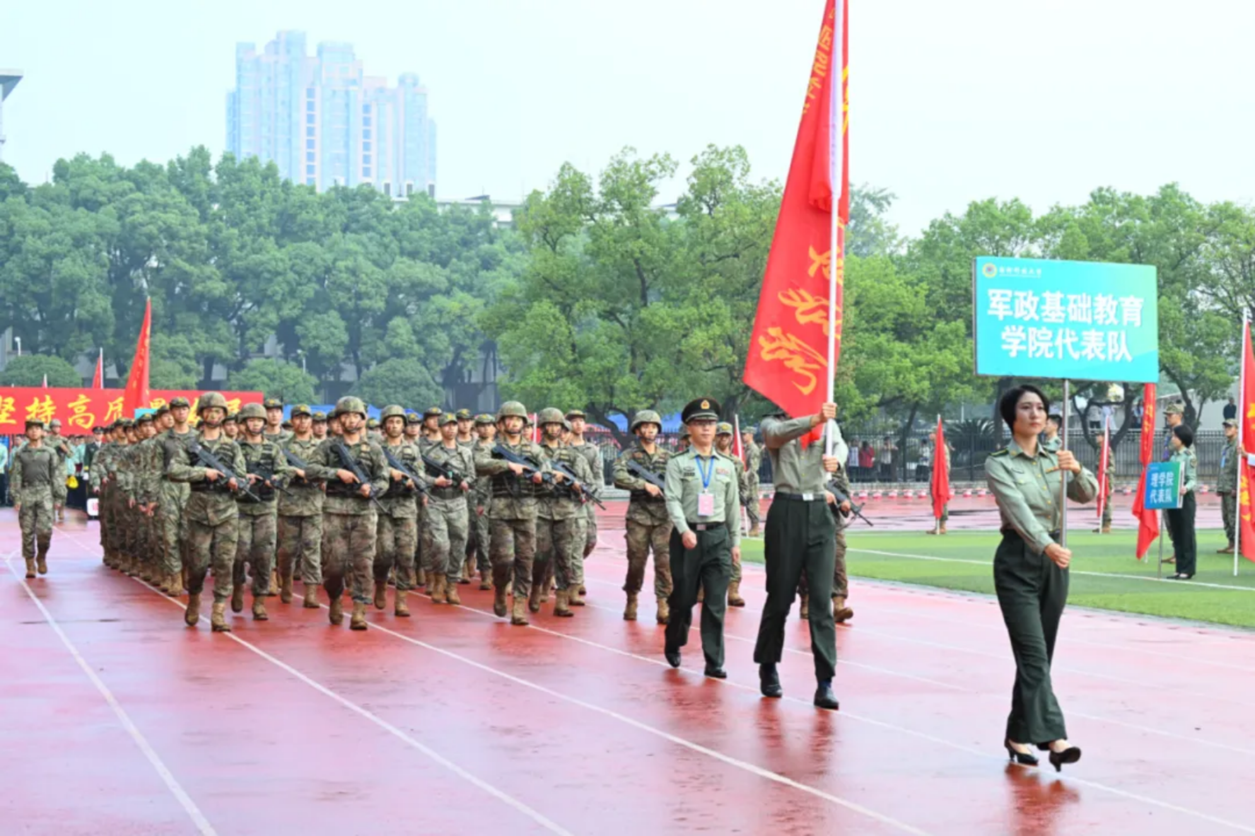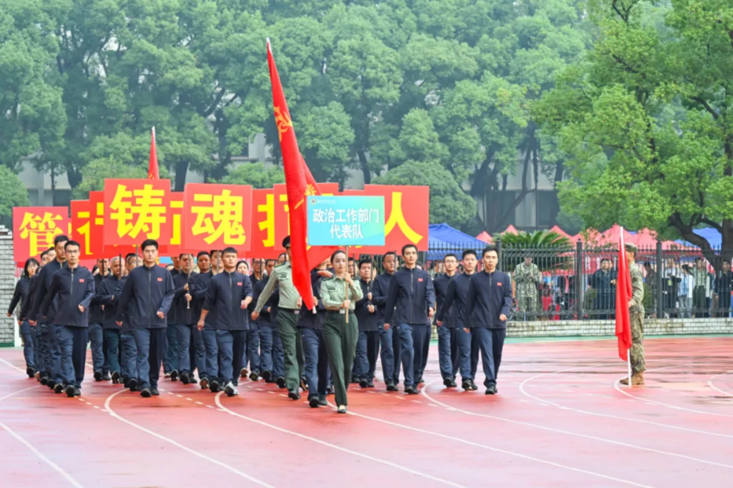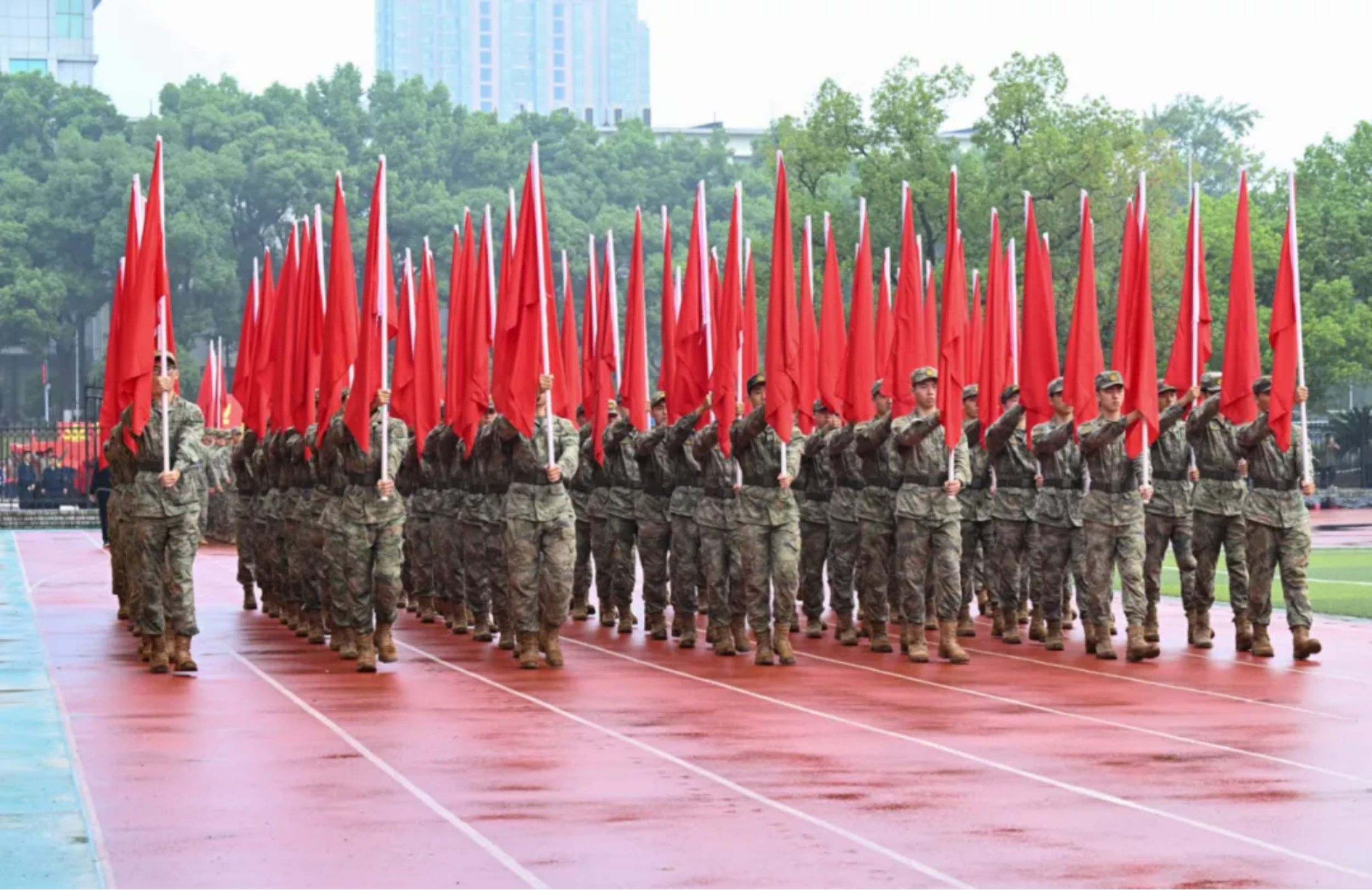 红旗猎猎,步伐铿锵。由军政基础教育学院学员某大队组成的红旗方阵走入会场。整齐的步伐迈在赛道上,也迈在奋进一流的征程上。