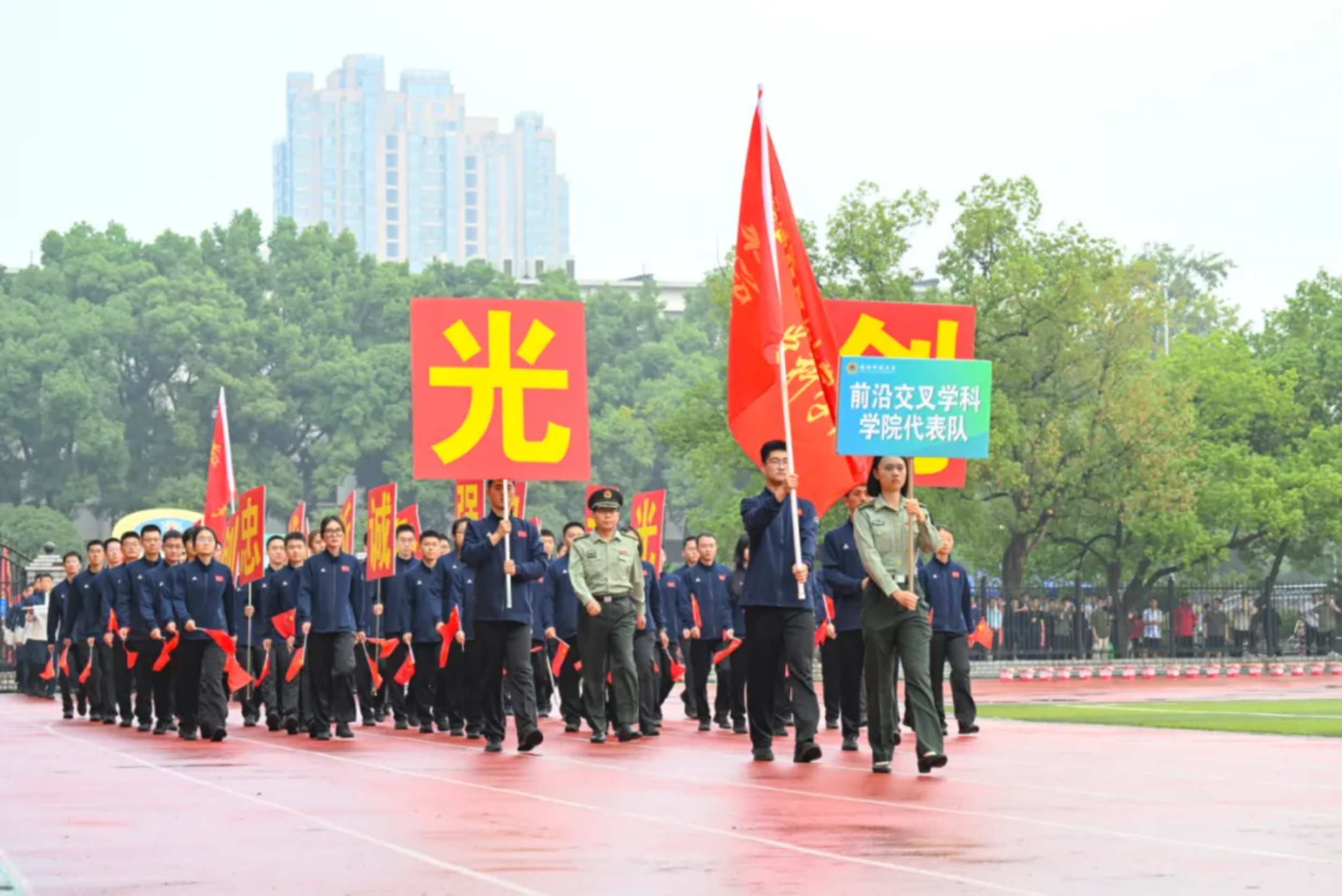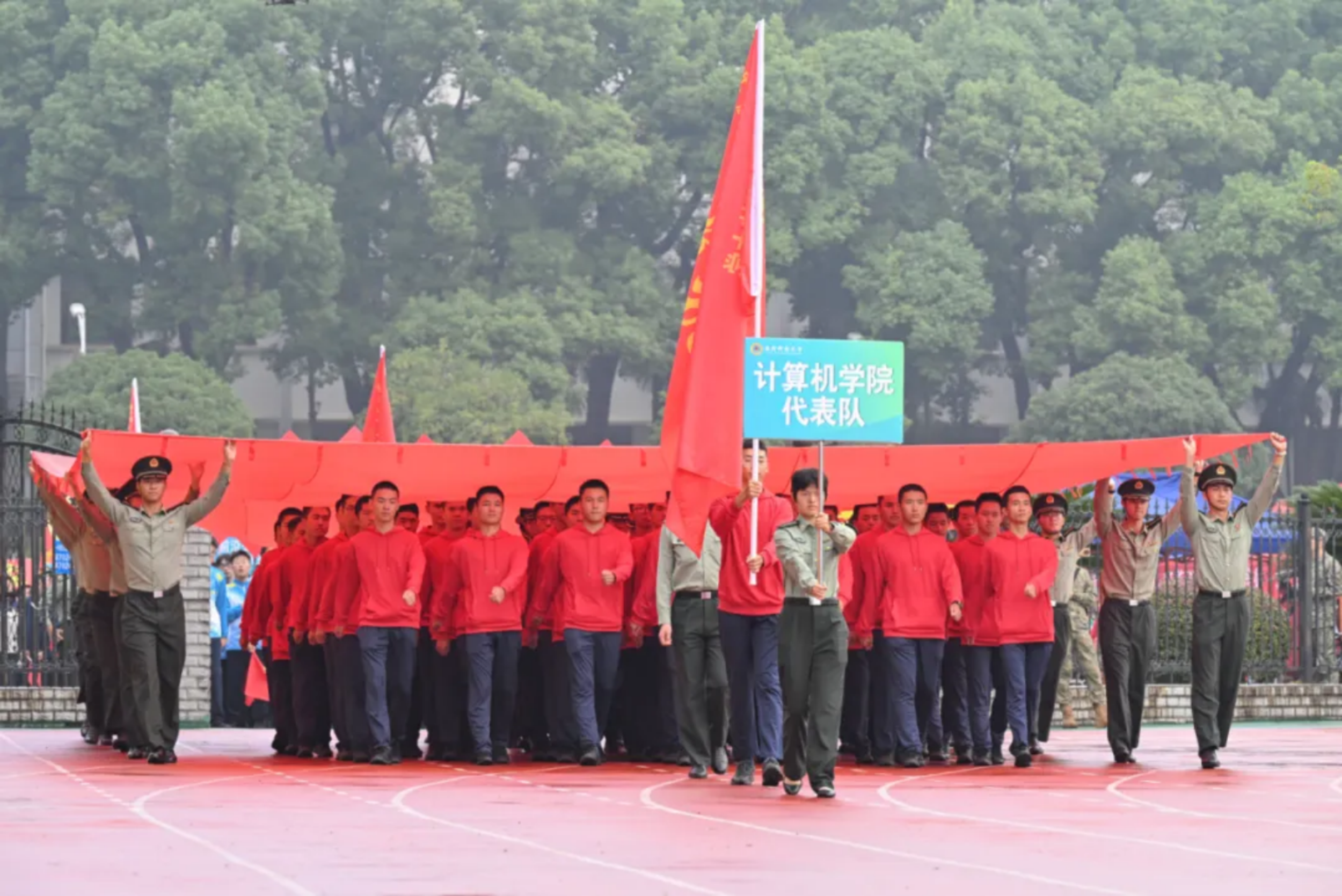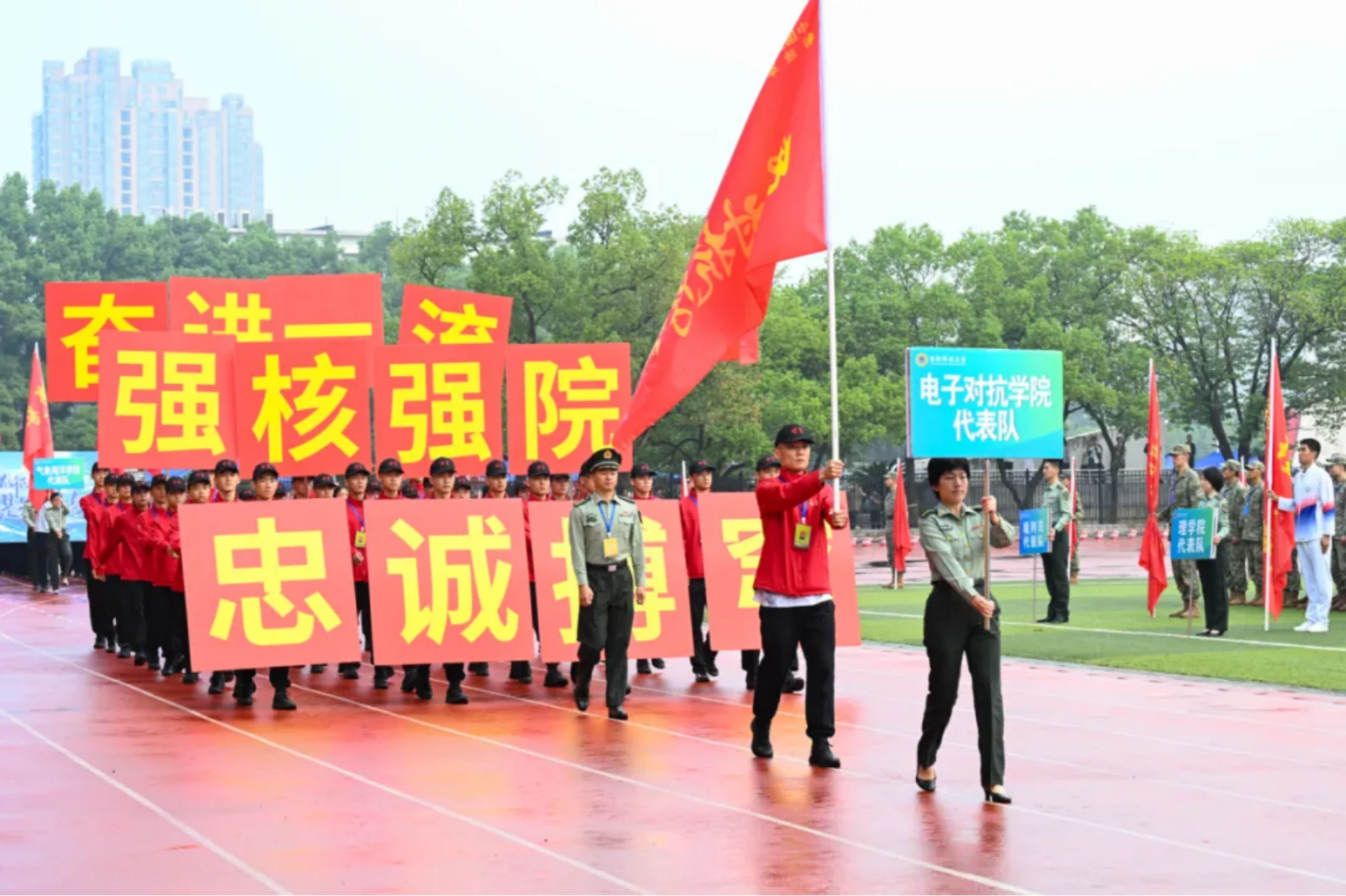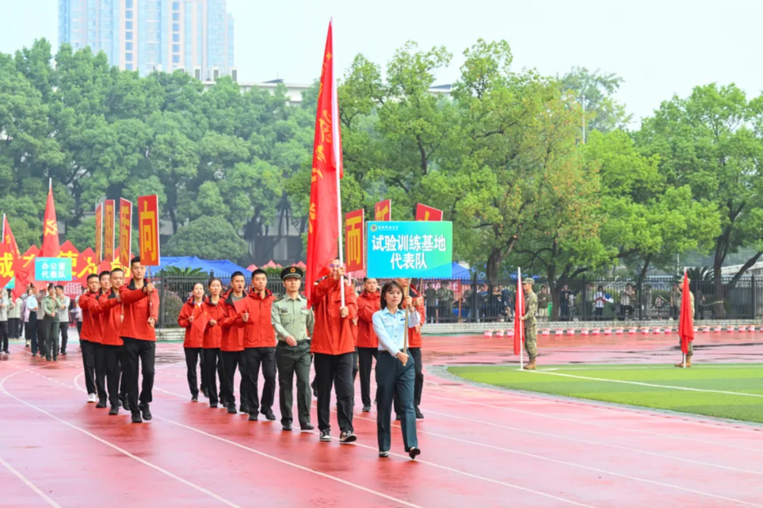 红旗猎猎,步伐铿锵。由军政基础教育学院学员某大队组成的红旗方阵走入会场。整齐的步伐迈在赛道上,也迈在奋进一流的征程上。