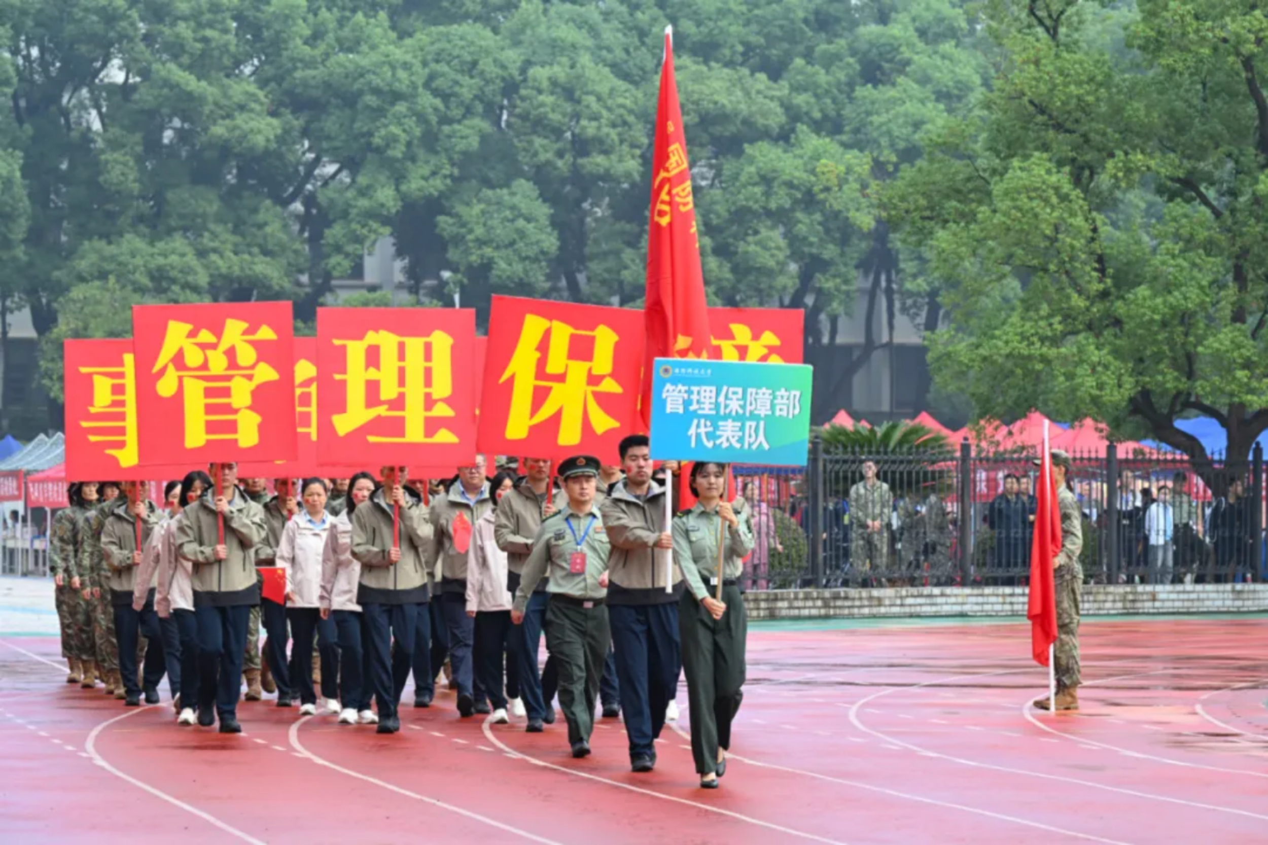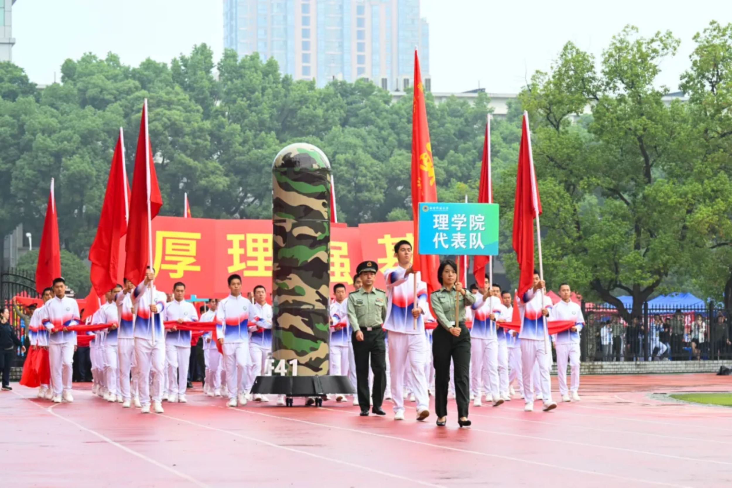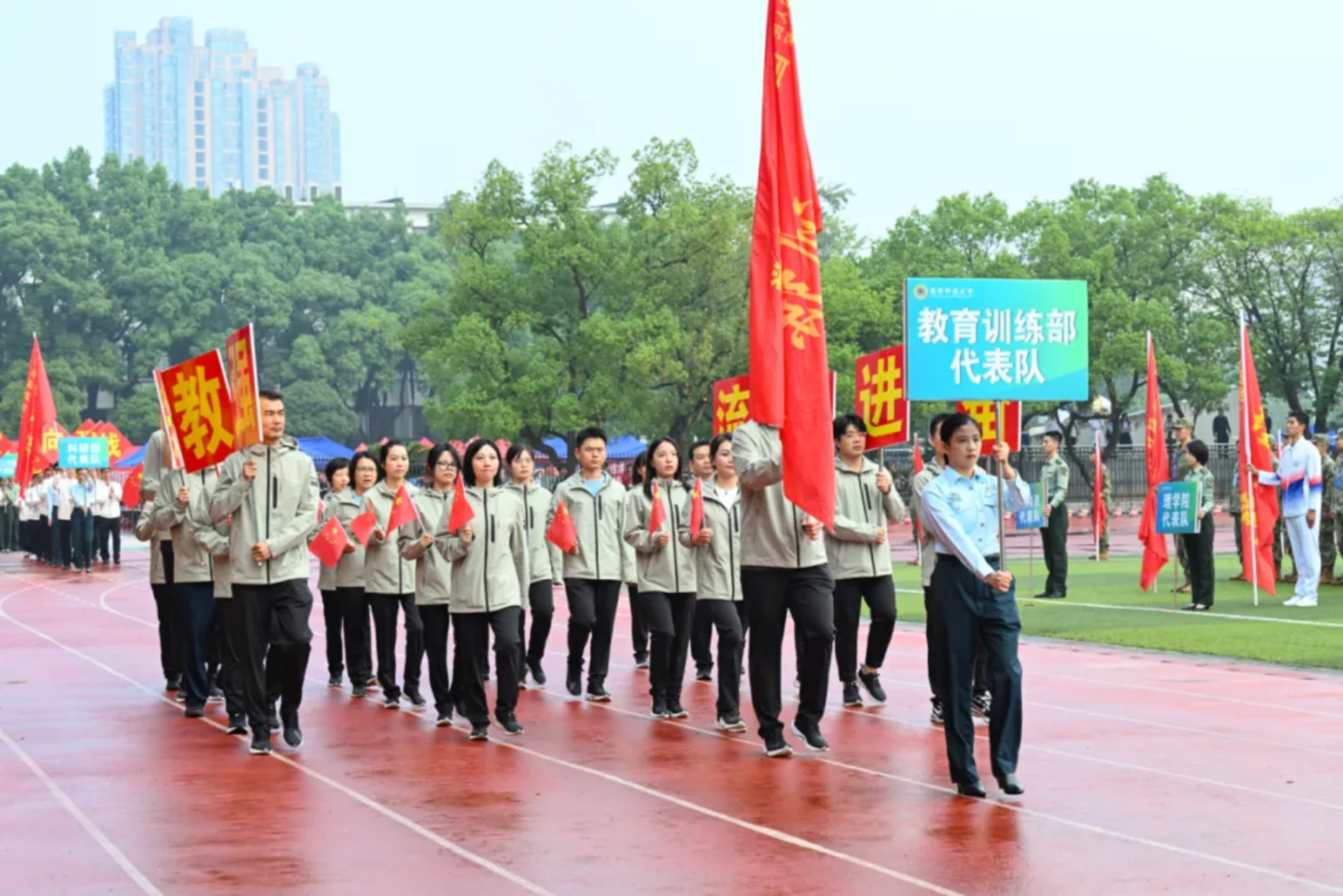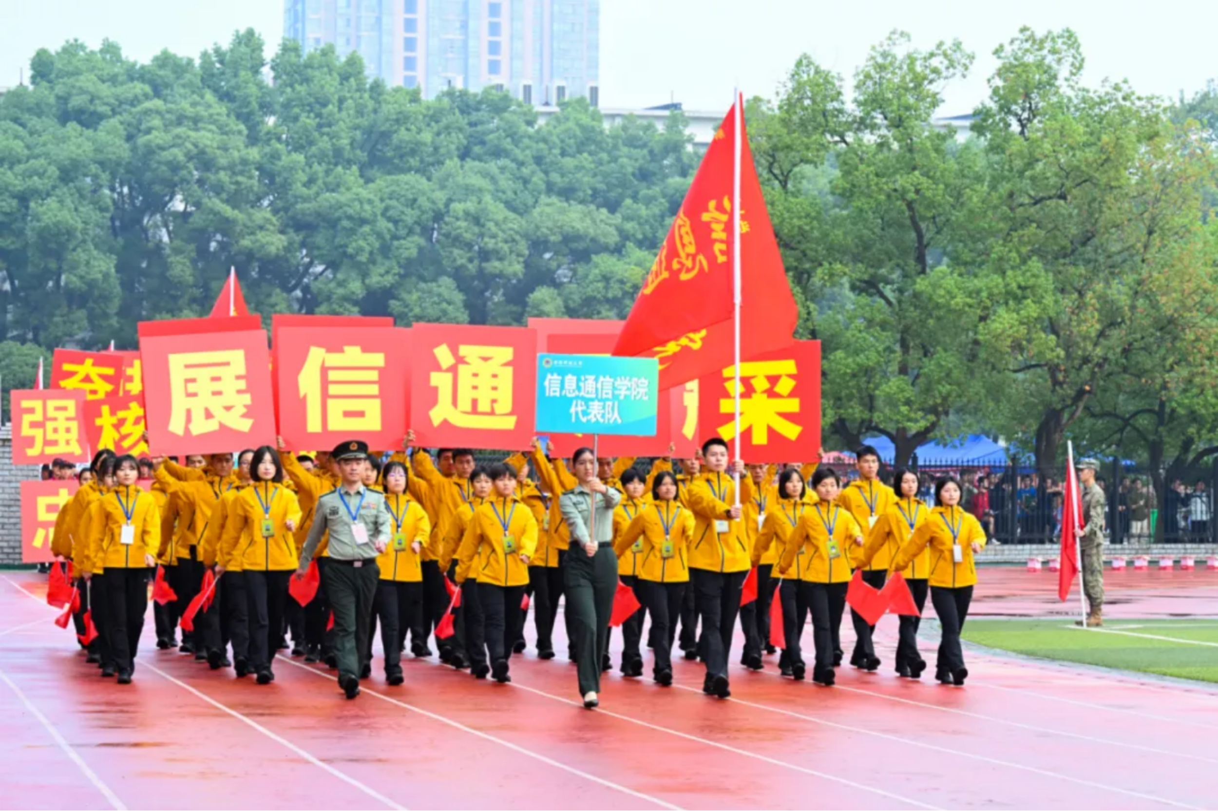 红旗猎猎,步伐铿锵。由军政基础教育学院学员某大队组成的红旗方阵走入会场。整齐的步伐迈在赛道上,也迈在奋进一流的征程上。